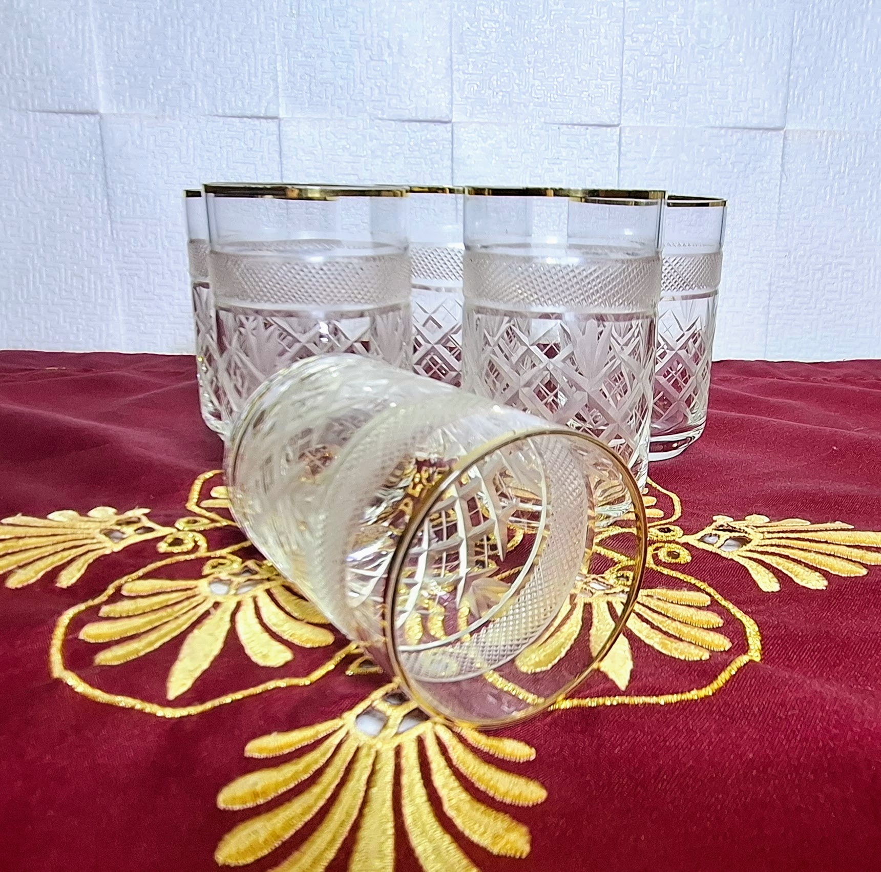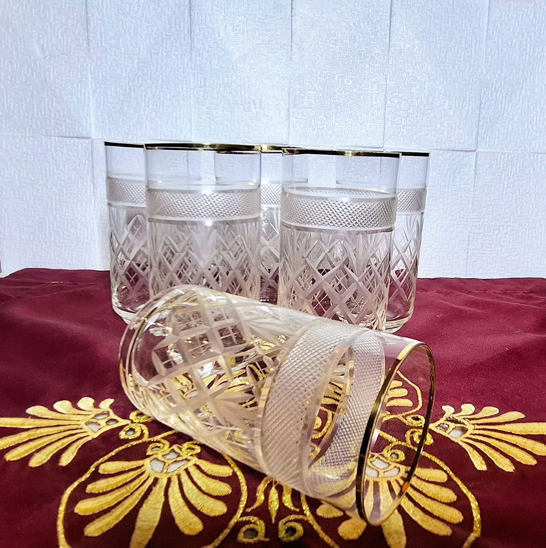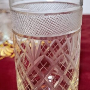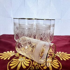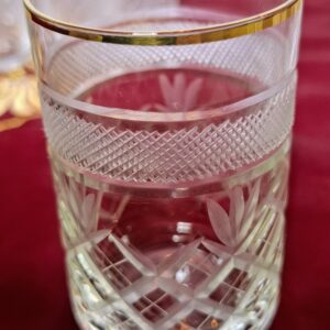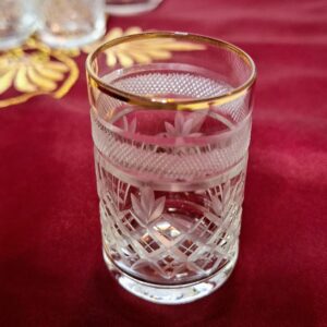 Különleges, 18 darabos vintage kristálypohár készlet, amely minden terítést ünnepi hangulatba öltöztet. A poharak kézi csiszolással készültek, rácsos és levélmintával, felső részükön elegáns frottírozott (csiszolt hálóminta) sávval. A finom aranyszegély teszi teljessé a klasszikus, kifinomult megjelenést.