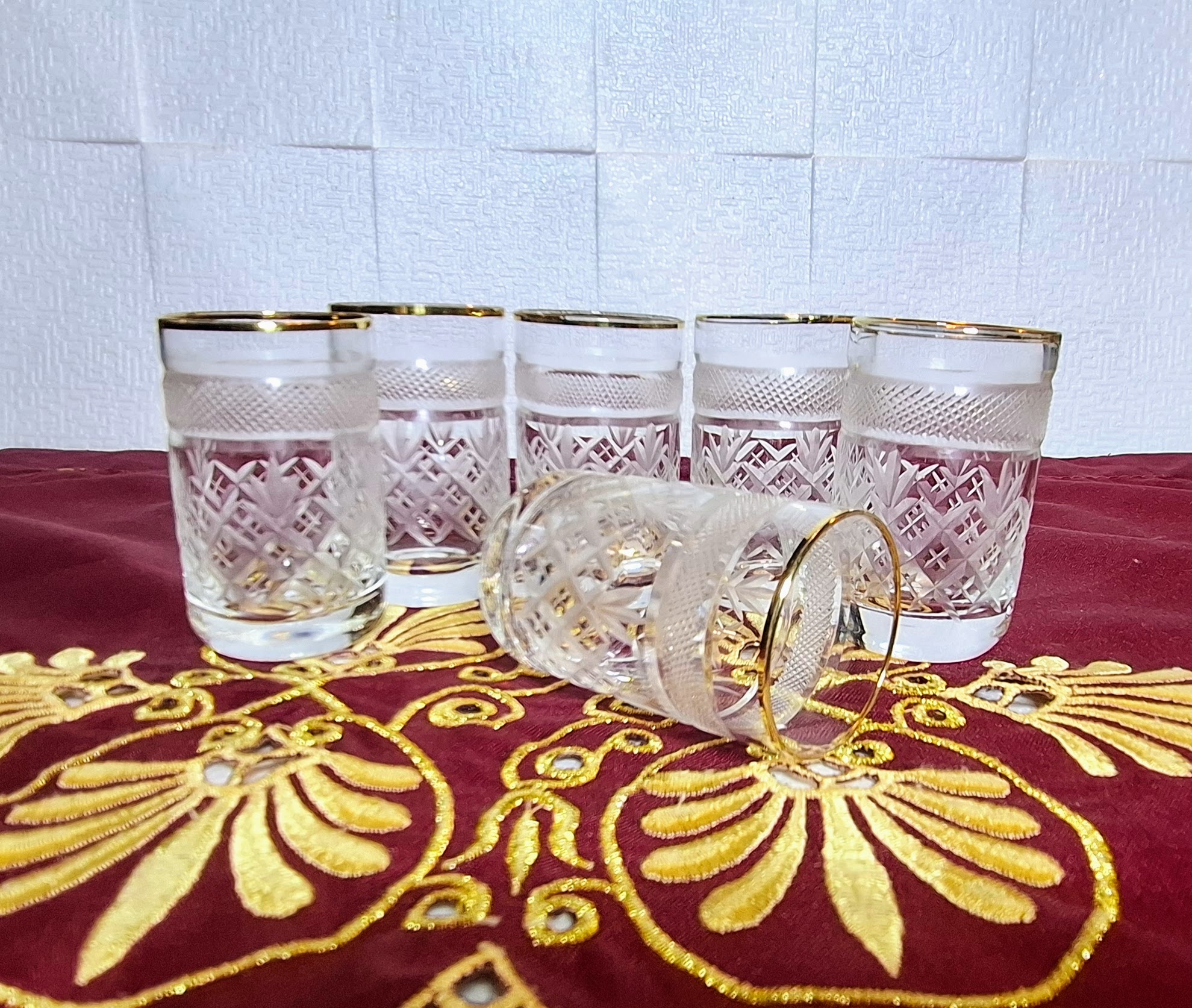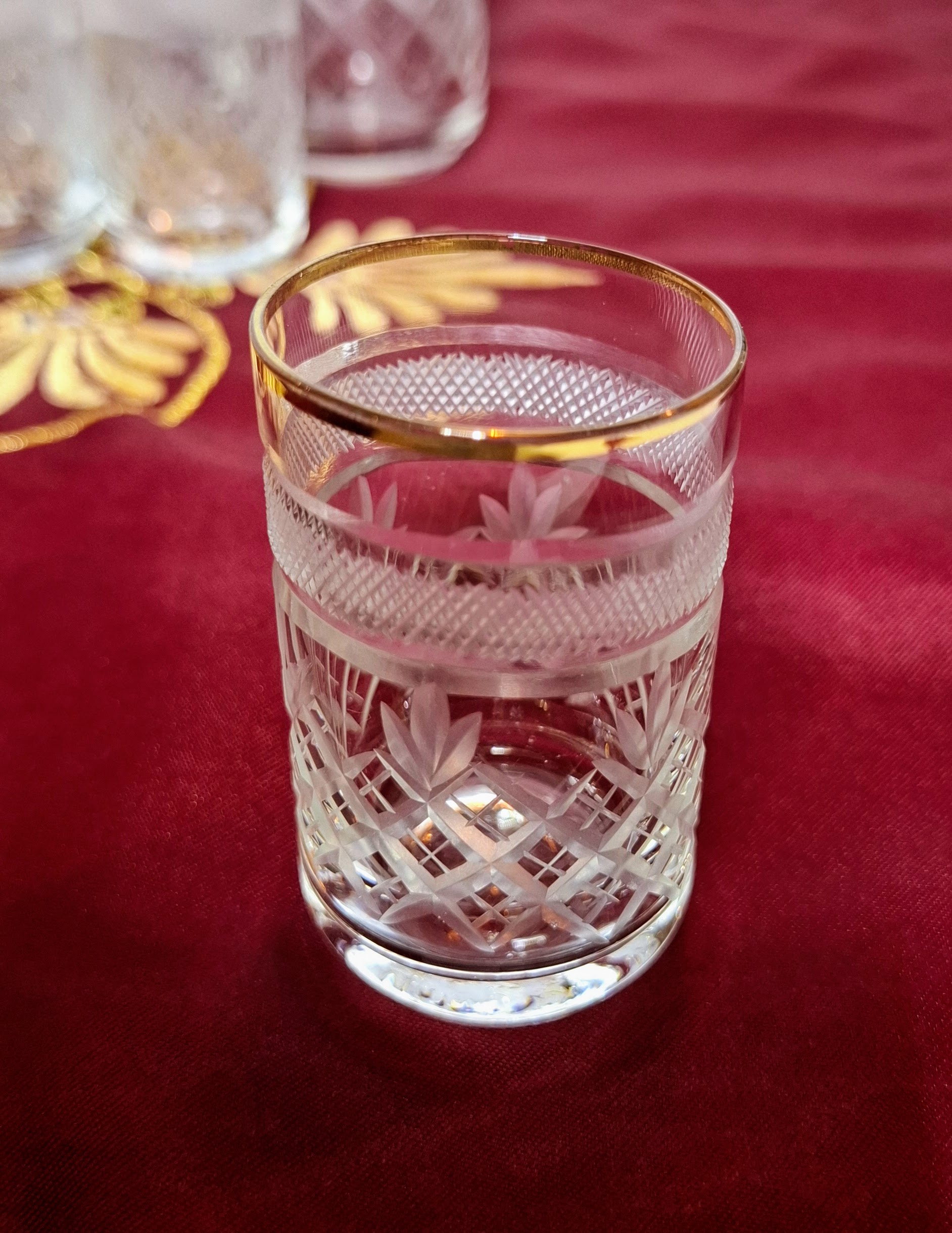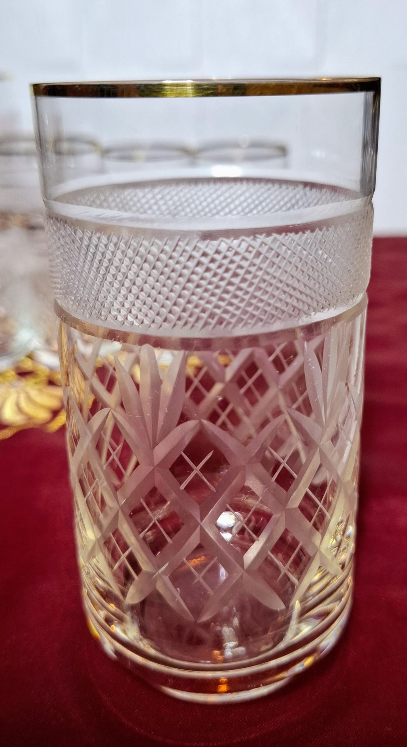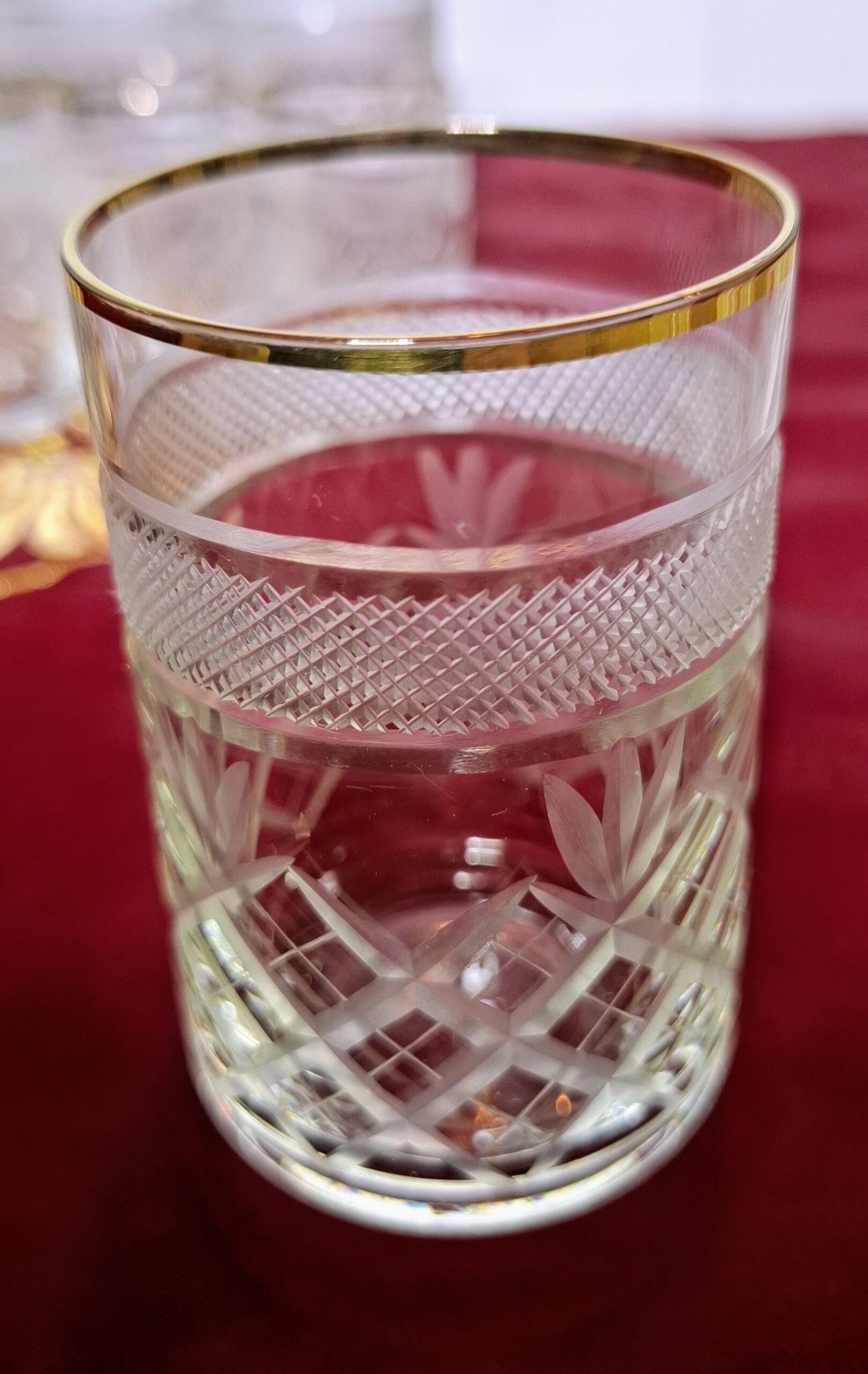 A special, 18-piece vintage crystal glass set that dresses every table setting in a festive mood. The glasses are meticulously hand-cut with a lattice and leaf pattern, featuring an elegant frosted (cut mesh pattern) band near the top. A fine gold rim completes their classic, refined appearance. The complete set consists of three sizes, ensuring the perfect glass for every beverage: 6 large glasses (~2 dl) for water, cocktails, or long drinks; 6 medium glasses (~1 dl) for wine, juice, or aperitifs; and 6 small glasses (~0.33 dl) for liqueurs, schnapps, or digestifs.