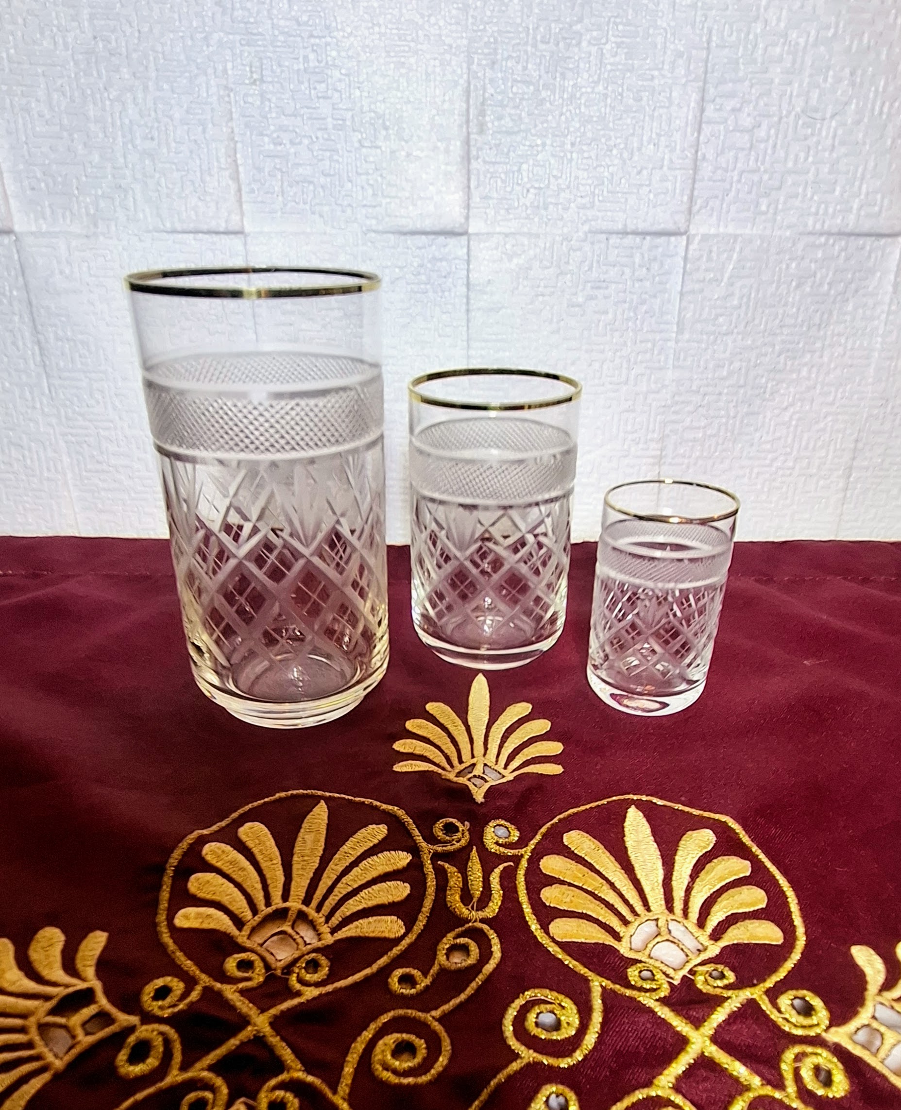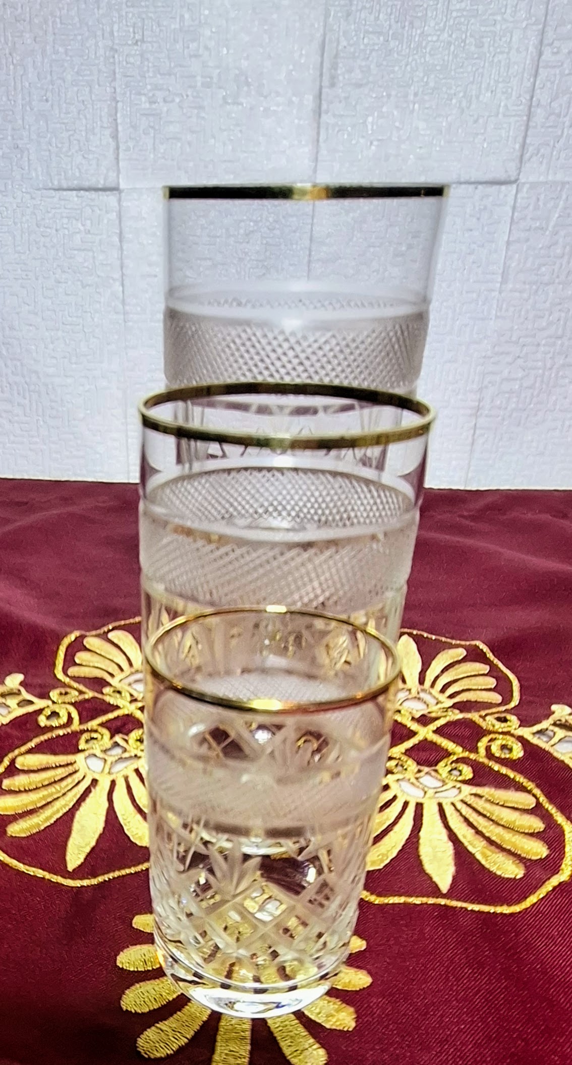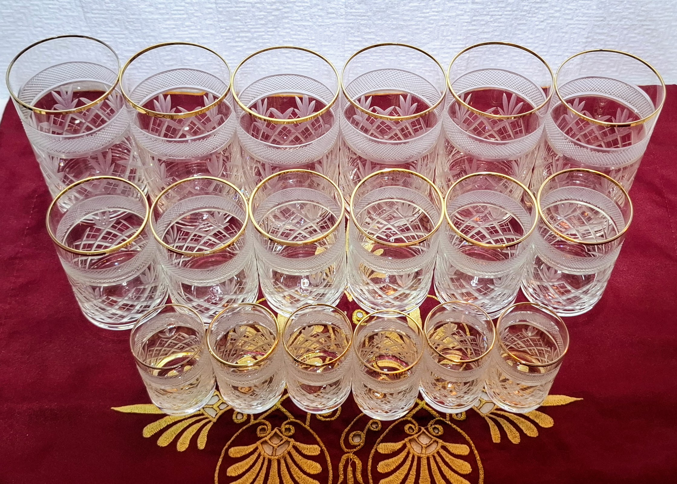 Elegant, 18-piece gold-rimmed crystal glass set in three sizes. Flawless condition, classic cut pattern, true retro luxury for festive table settings.