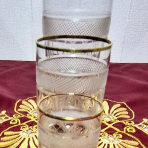 The condition is flawless, a true collector’s treasure. There are no cracks or chips, and the gilding is beautifully and evenly preserved. The pieces are bright, pristine, and clearly rarely used. Dating back to the 1960s or 70s and originating from Central Europe (presumably Czech or Hungarian production), the dimensions are as follows: large glasses are approx. 12.5 cm tall, medium glasses are approx. 9 cm tall, and the small glasses are approx. 6.5 cm tall. The total weight of the set is roughly 4.2 kg. This set is not only highly practical but also a magnificent table centerpiece that deserves a prominent place in any elegant home, whether for daily indulgence or special festive occasions.