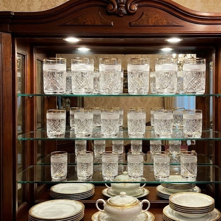 • Egy 18 darabból álló kristálypohár készlet a tálaló szekrény polcain