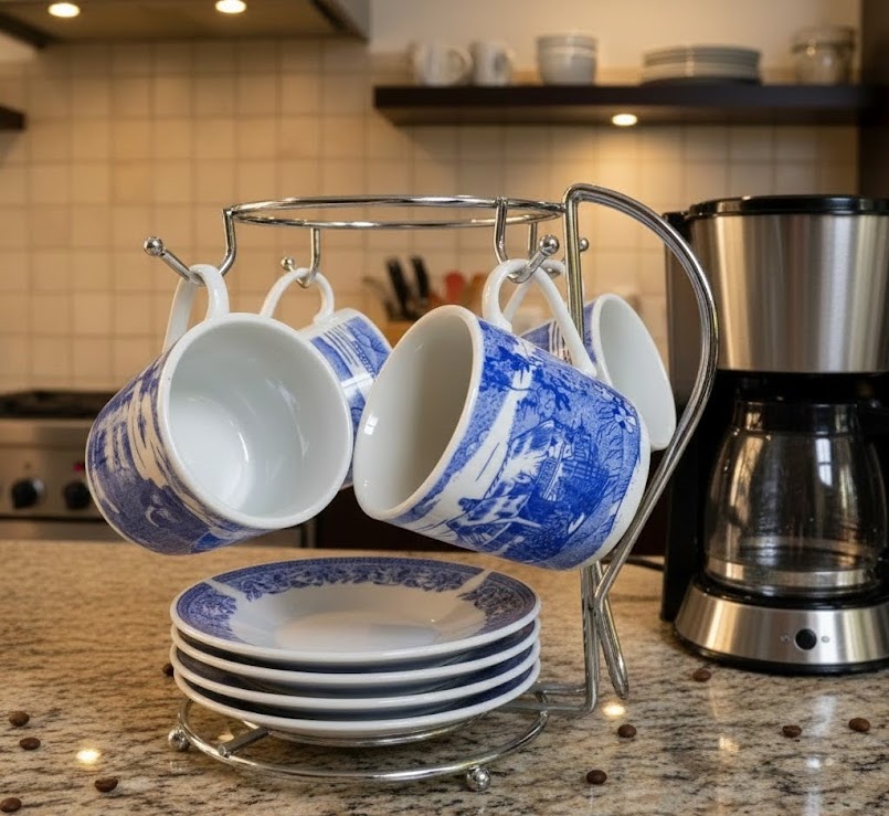 Hagyatékból származó AML angol mintás Cseh porcelán kávéskészlet fém tartóval (dobozos). Nem volt még használatban, egy szekrény mélyén lapult.