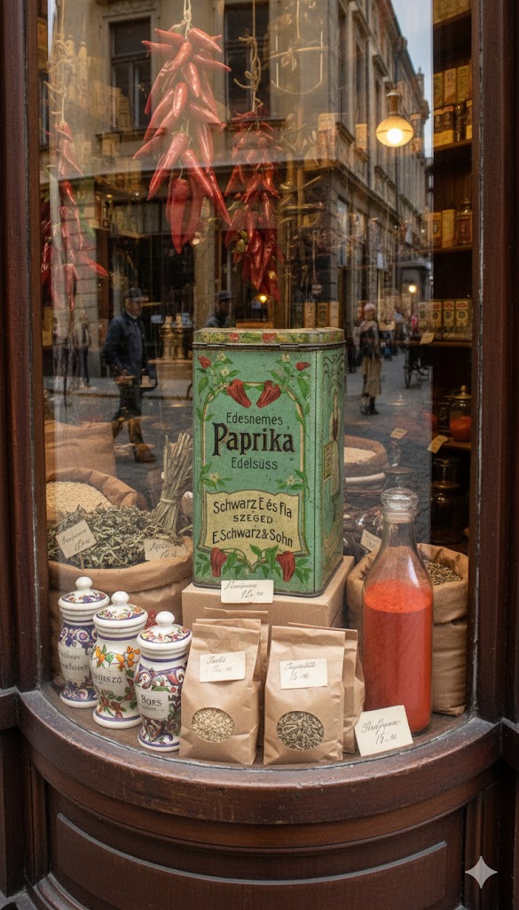 This antique sweet paprika tin dates back to around 1910 and was produced for Schwarz E. és Fia, a historic Hungarian paprika merchant based in Szeged—one of the most important centers of paprika production in Hungary.