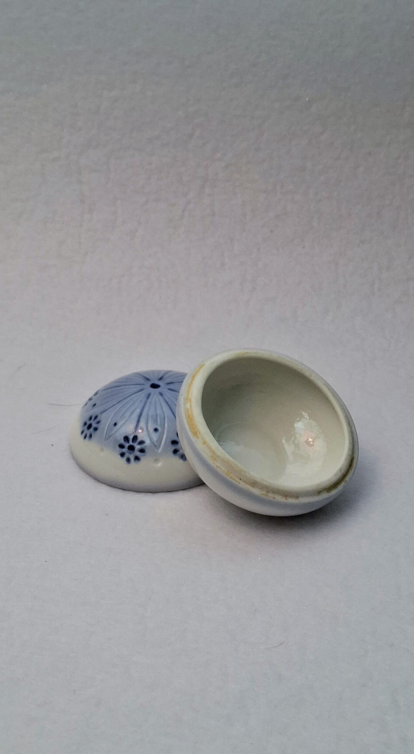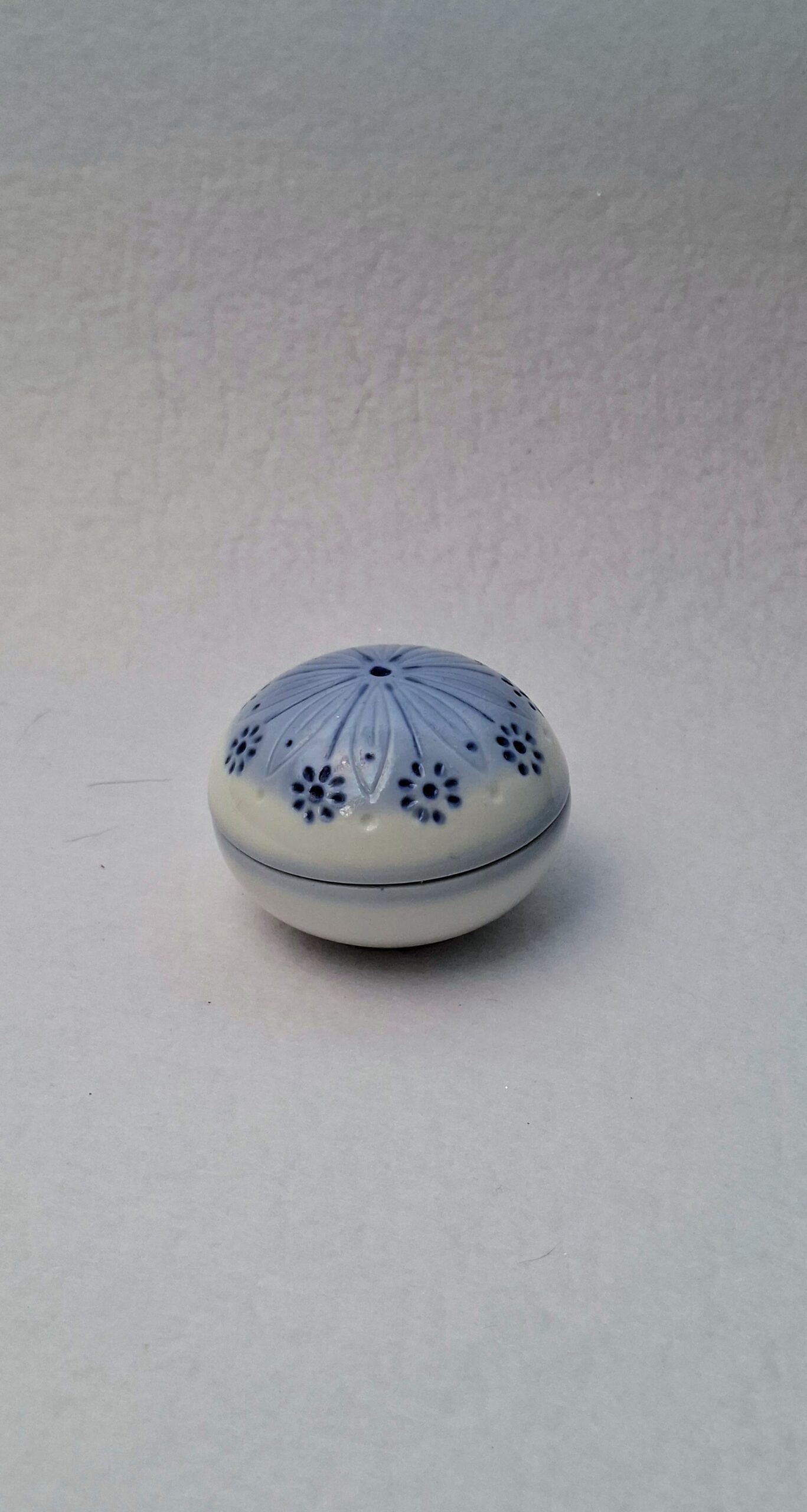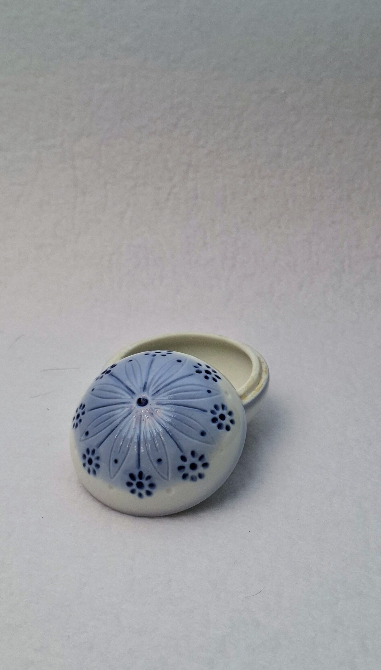 Finom, halványkék-fehér színvilágú, kerek kis porcelándoboz, a tetején domború (relief) virágmintás díszítéssel. A talpán jól olvasható „Aquincum Budapest” jelöléssel.