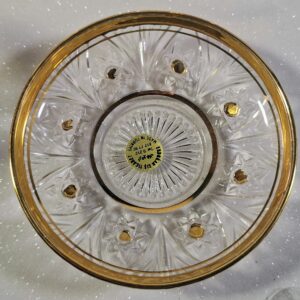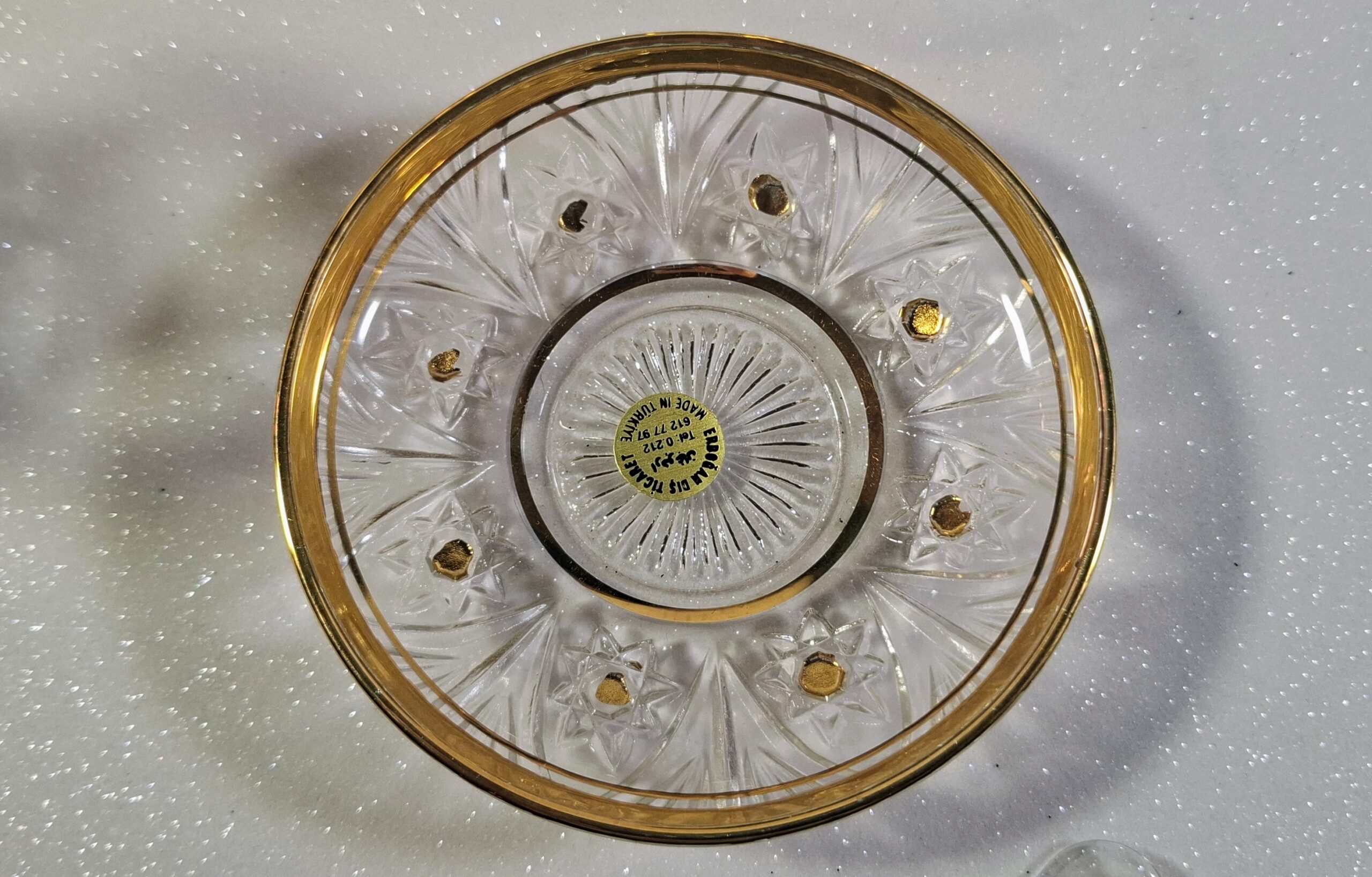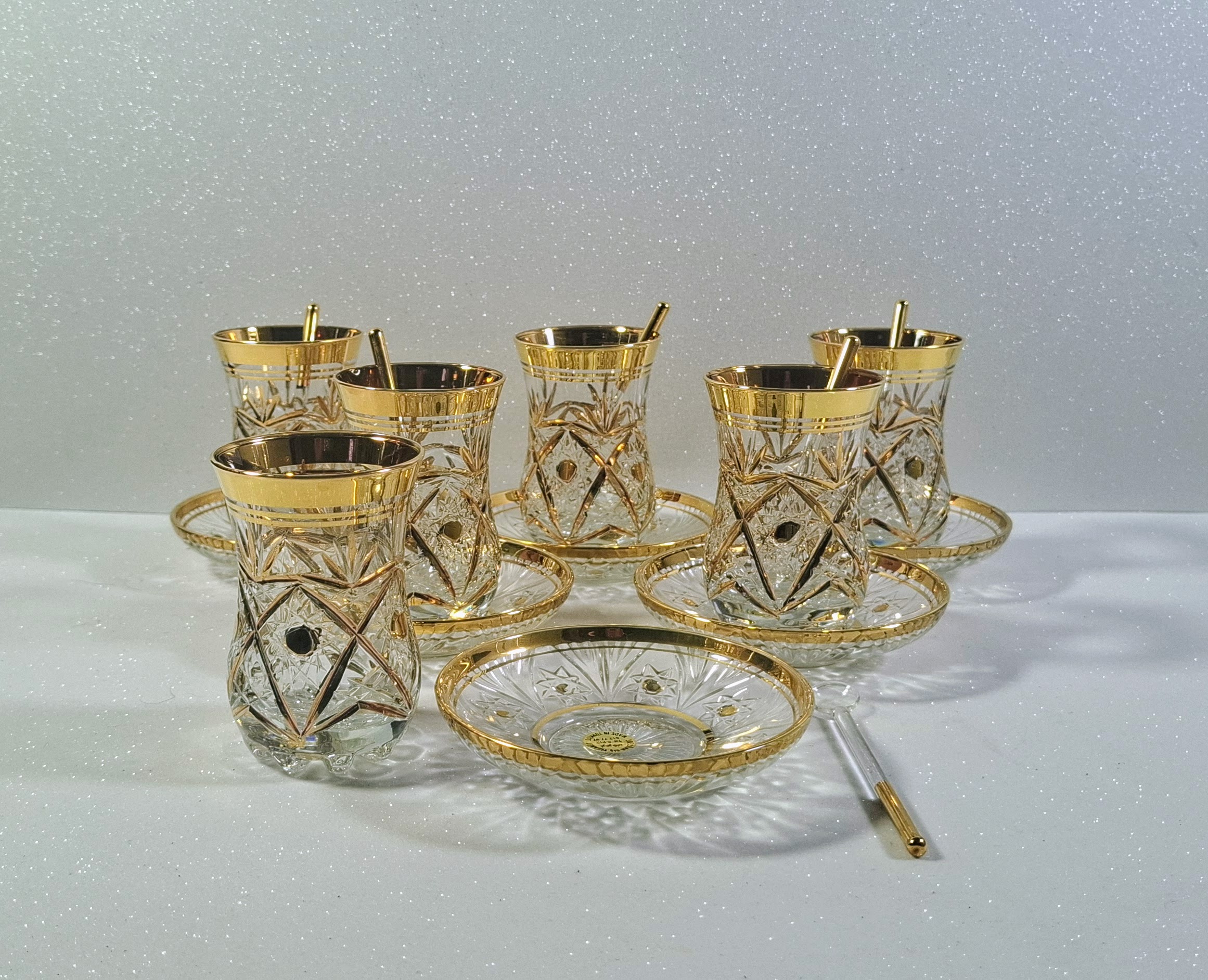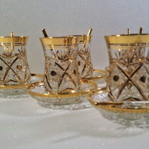 This elegant, hand-gilded, and cut glass tea set arrived from the heart of Turkey. The set includes 6 traditional tulip-shaped glasses (8.5 cm tall, 5.5 cm diameter), 6 matching decorative saucers (10 cm diameter), and 6 rare, gilded-handle glass spoons (9.5 cm long). The weight of the items (glass: 115g, saucer: 94g) indicates a solid, quality glass production. The set is completely new, unused, with the original exporter’s sticker still visible on one saucer. A perfect choice for lovers of oriental tea ceremonies or collectors.