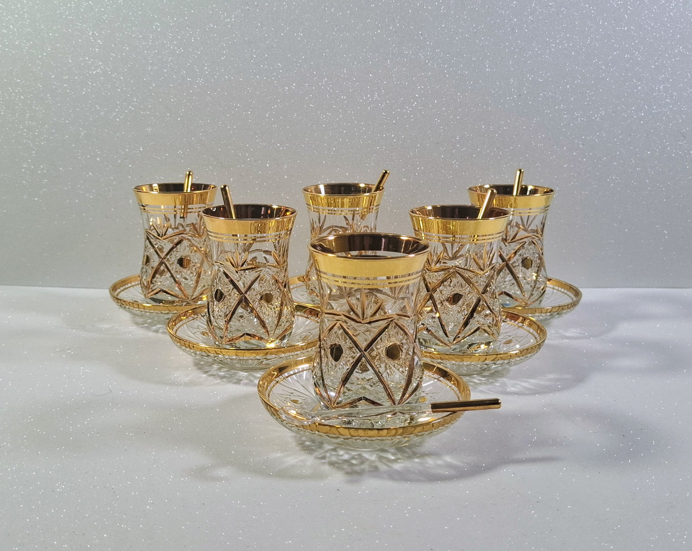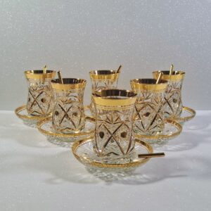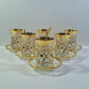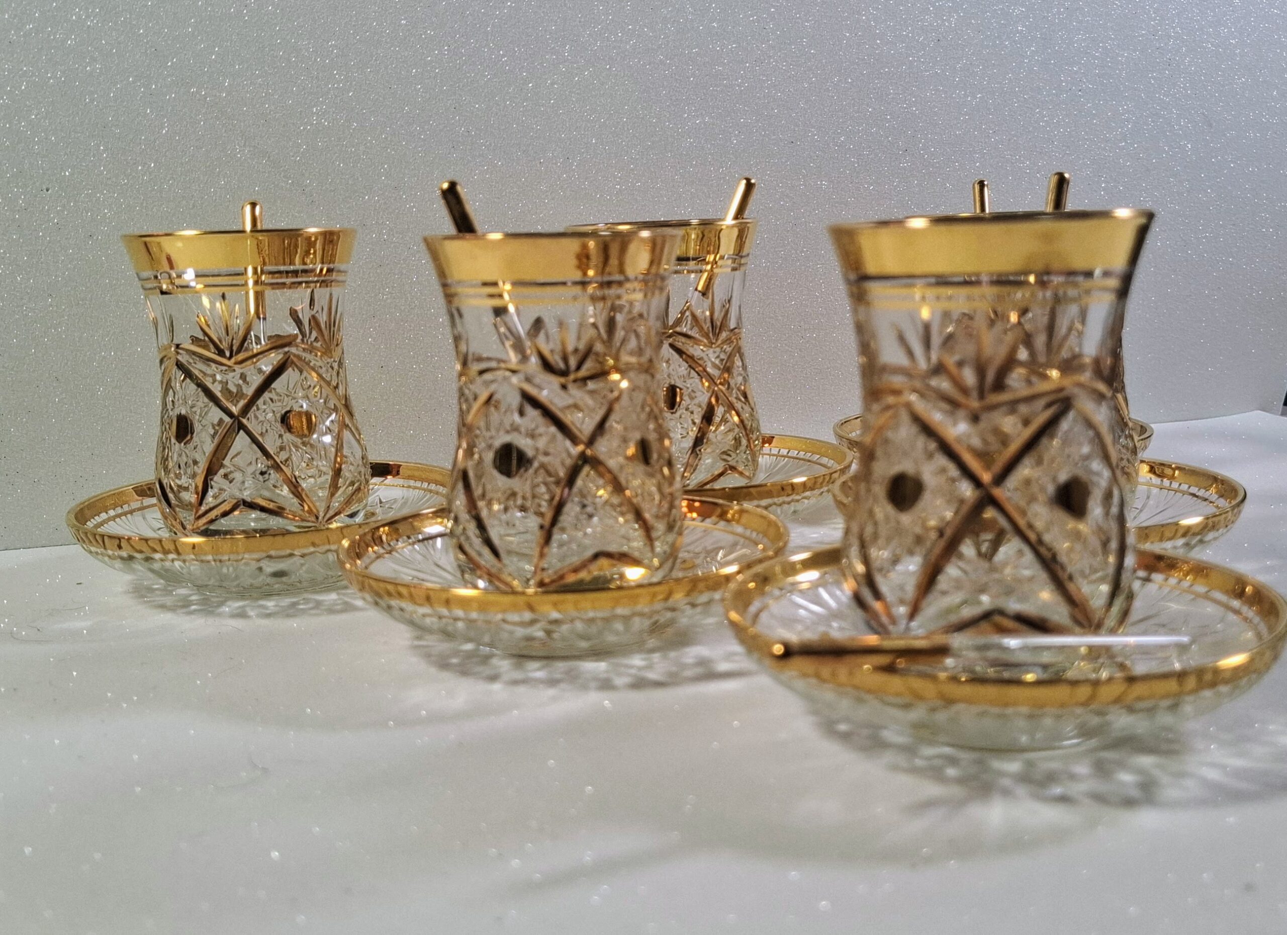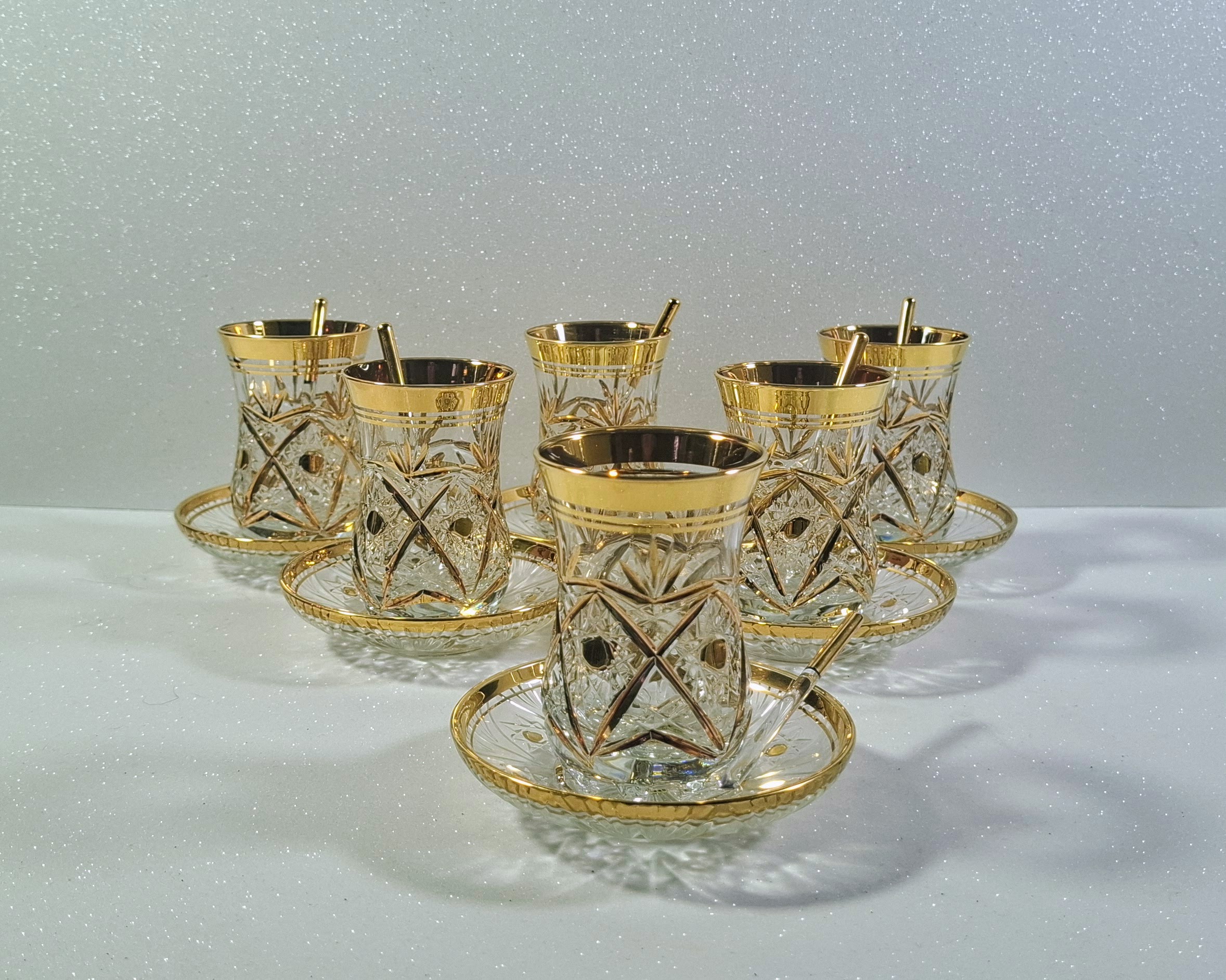 Autentikus Aranyozott Török Teáskészlet (6 Pohár, 6 Alj, 6 Üvegkanál) – Új / Authentic Gilded Turkish Tea Set (6 Glasses, 6 Saucers, 6 Glass Spoons) – New