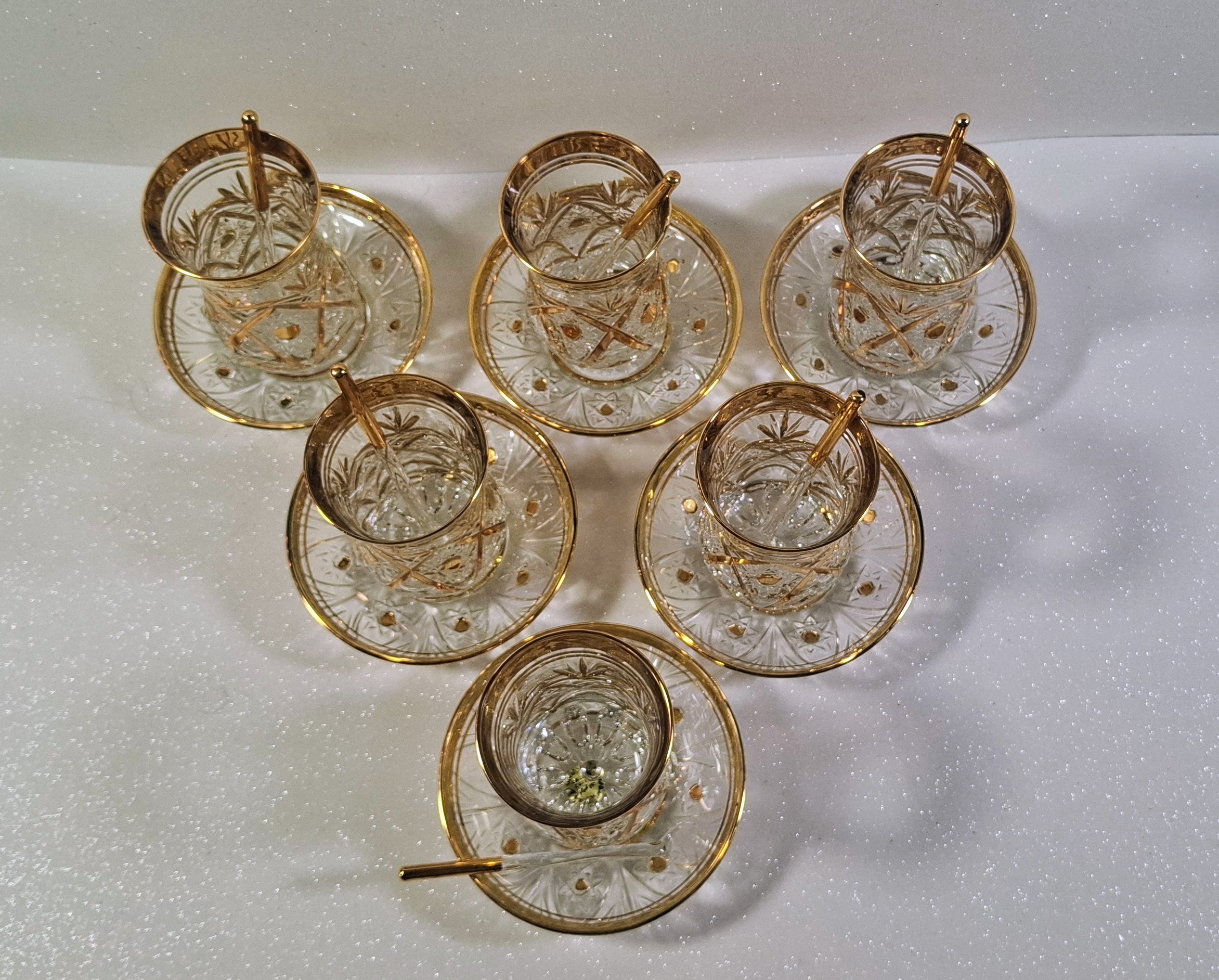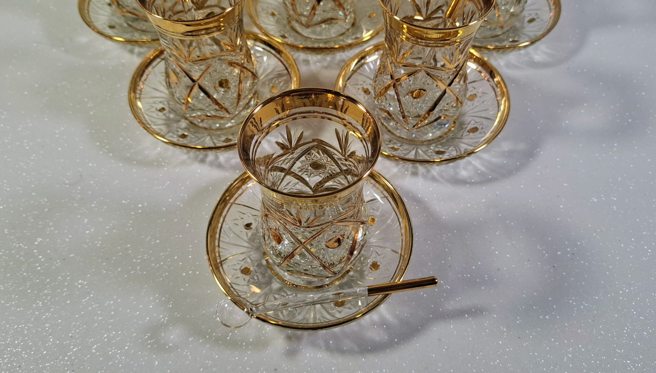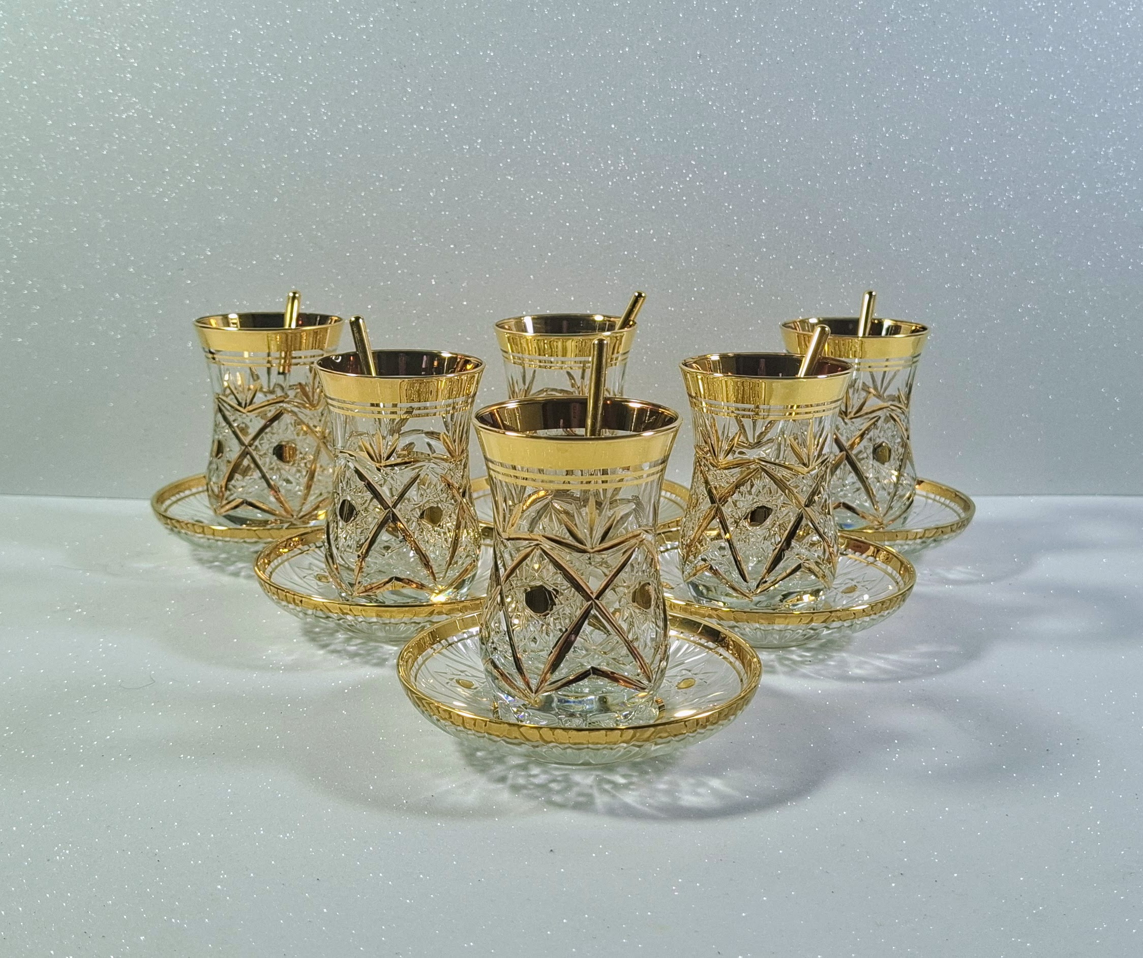 Autentikus Aranyozott Török Teáskészlet (6 Pohár, 6 Alj, 6 Üvegkanál) – Új / Authentic Gilded Turkish Tea Set (6 Glasses, 6 Saucers, 6 Glass Spoons) – New