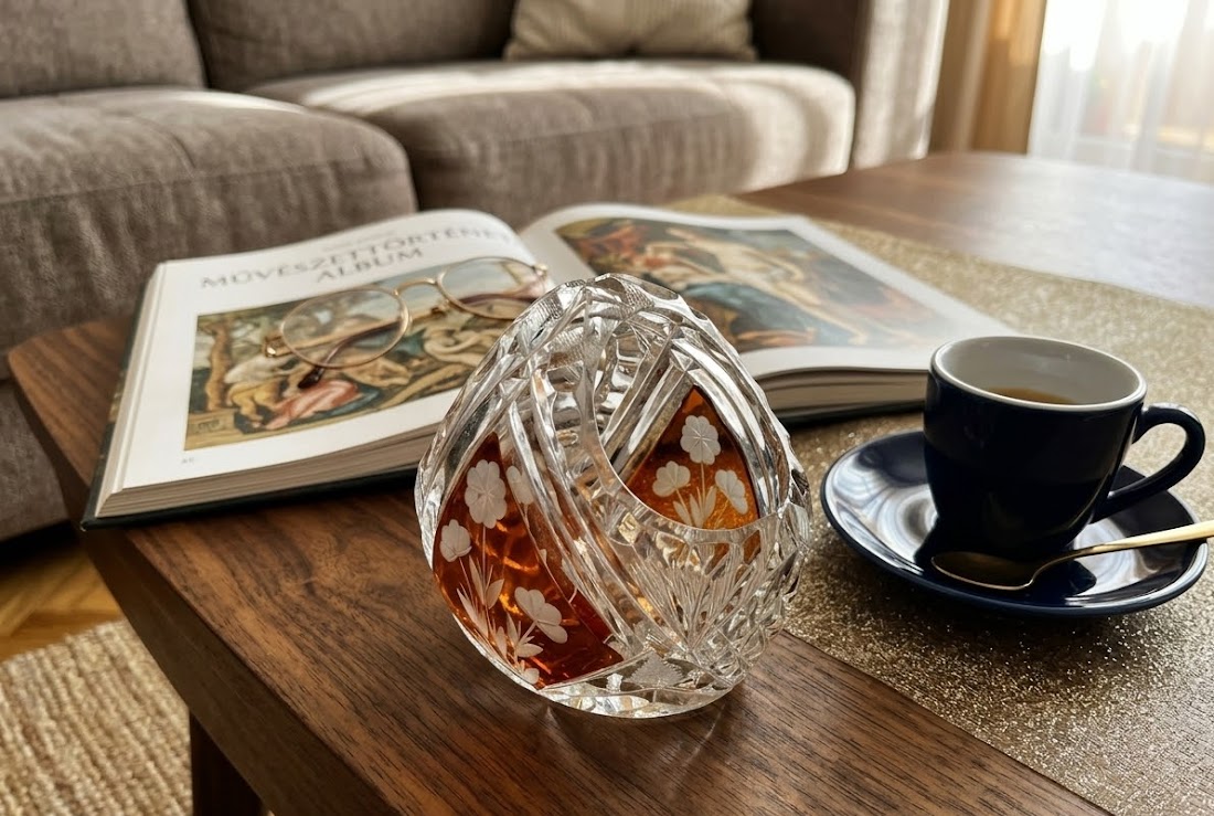 (HU) Ez a lenyűgöző kézműves alkotás a huszadik század közepéről származó prémium bajor üvegművészet remeke. A tiszta kristályból faragott kosárka egy bonyolult technikai bravúrt rejt magában: egy sötétebb, borostyánsárga színű üvegréteget (‘flash’) hordtak fel az alapra, majd ezt a felületet kézzel vésték át, hogy előbukkantassák a finom virágmotívumokat (edelweiss-szerű és mezei virágok). Ez a technika mélységet és színkontrasztot kölcsönöz a darabnak. A tárgy többi részét mély, mértani és csillagszerű csiszolások ékesítik, amelyek minden szögből megtörik a fényt. A kosárka tökéletes ‘vitrin állapotú’, makulátlan, sértetlen gyűjtői darab, melyet soha nem használtak és gondosan tároltak. Különleges, kifinomult darab, mely otthonának vagy gyűjteményének ékköve lehet.