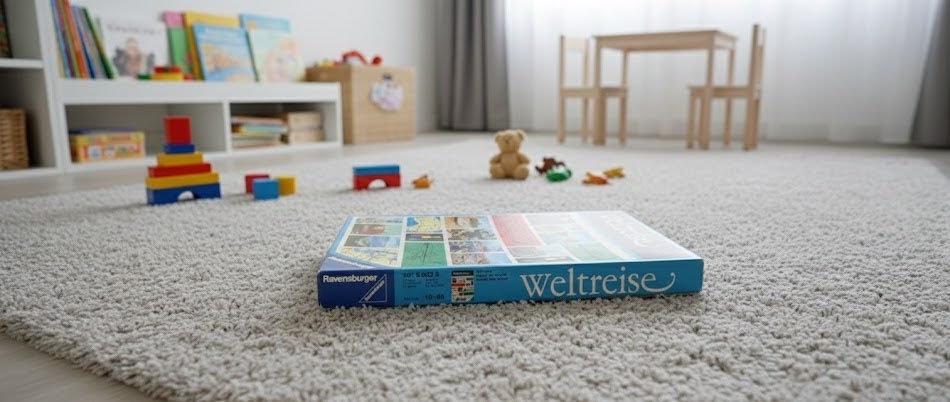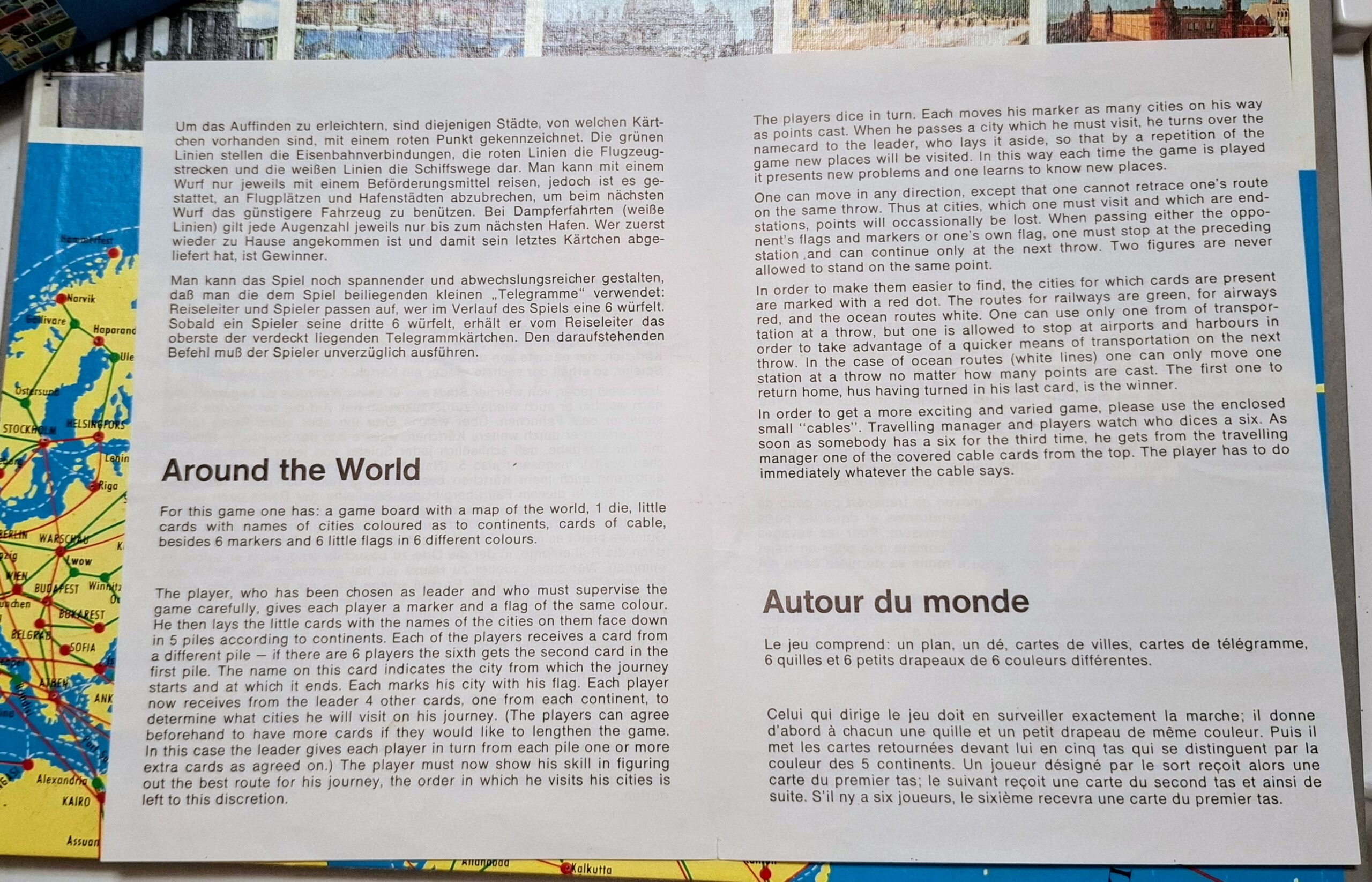 A készlet rendkívül igényes: tartalmaz egy nagyméretű világtérképet, színes városkártyákat, bábukat és zászlókat. Külön ritkaság, hogy a csomag része az eredeti, többnyelvű (német, angol és francia) szabályzat is, ami a nemzetközi terjesztés egyik korai példája. A játék mechanikája a városok közötti optimális útvonal megtervezésére épül, miközben a játékosok észrevétlenül tanulják meg a kontinensek földrajzát. Gyűjtői állapotú darab, amely mind esztétikailag, mind történeti szempontból kiemelkedő értéket képvisel a retró játékok kedvelői számára.