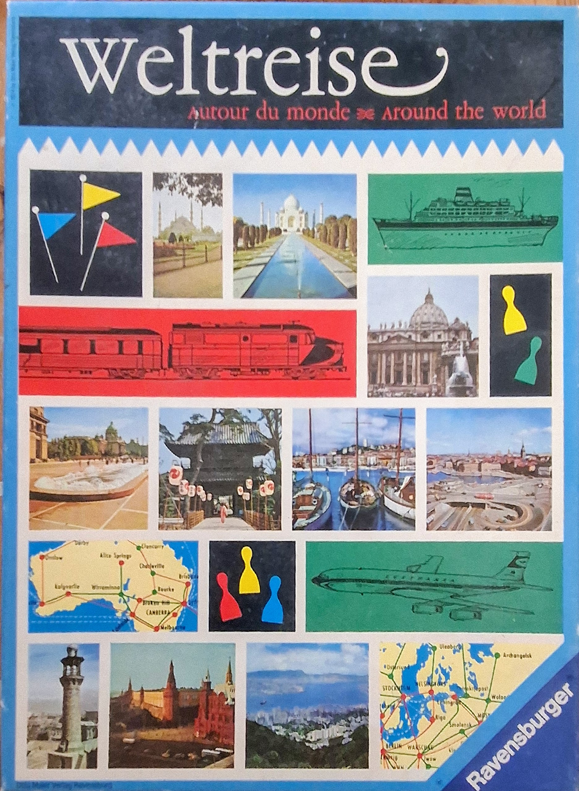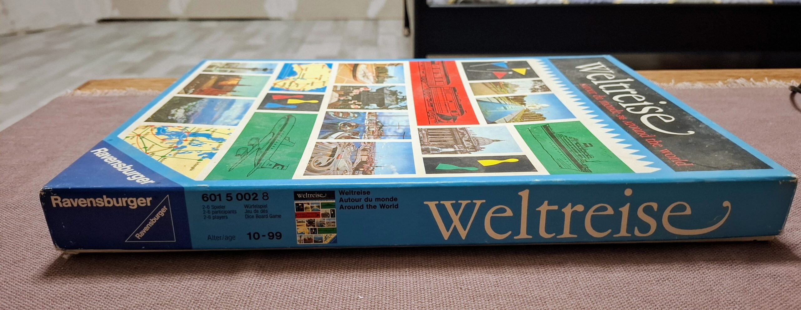 Klasszikus Ravensburger társasjáték 1968-ból, eredeti NSZK (Western Germany) kiadás. A „Weltreise” (Világ körüli utazás) egy elegáns, oktató jellegű stratégiai játék, amely a 60-as évek nosztalgikus világképét és utazási kultúráját idézi meg.
