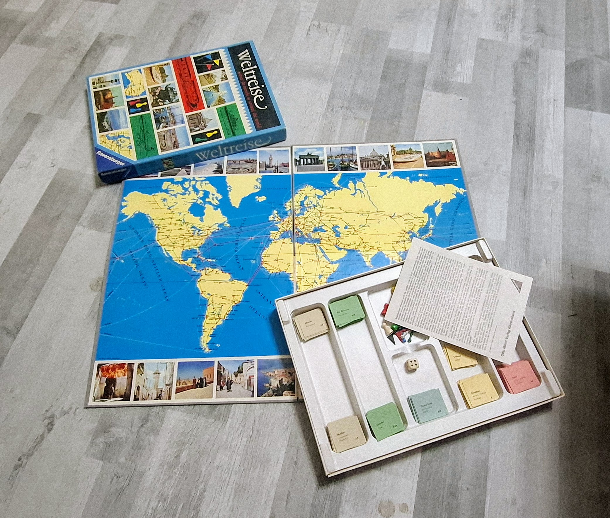 A classic Ravensburger board game from 1968, original West German edition. „Weltreise” (Around the World) is an elegant, educational strategy game that captures the nostalgic worldview and travel culture of the 1960s.