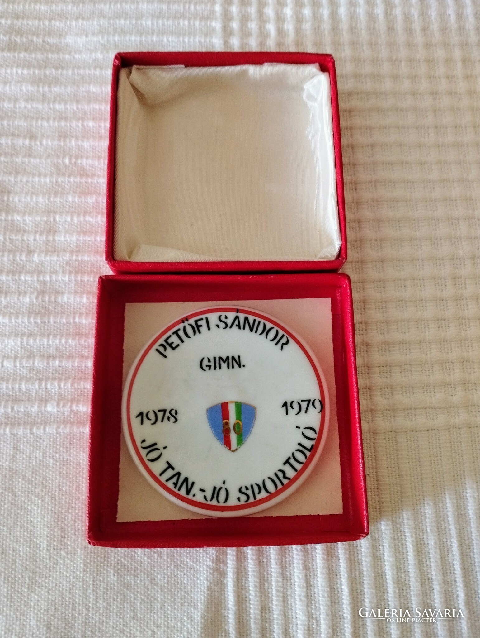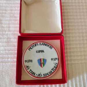 (HU) Hagyatékból származó, eredeti piros díszdobozában megőrzött Hollóházi porcelán emlékplakett. Az 1978-79-es tanév „Jó tanuló – Jó sportoló” díjazottjainak készült, címerrel díszített ritka, hibátlan gyűjtői darab.