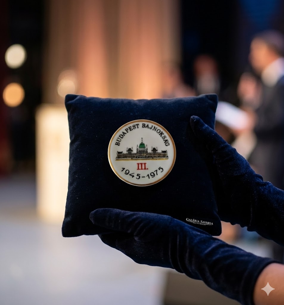 (EN) This snow-white Hollóháza porcelain plaque is a small but highly evocative time capsule of Hungarian sports history from the 1970s. Awarded to the bronze medalist of the 1975 Budapest Championship—reportedly an excellent sports shooter—the prize features a meticulous graphic of the Hungarian Parliament with its green dome and period-typical classic typography. The „1945-1975” inscription refers to the 30th-anniversary commemorative competition of the liberation. Framed by a thin, noble gold rim, the reverse side bears the green fir tree Hollóháza hallmark as a testament to the quality of domestic porcelain manufacturing. This carefully preserved relic from an estate awaits in immaculate, display-ready condition to become a cherished, storytelling part of a sports history or porcelain collection.