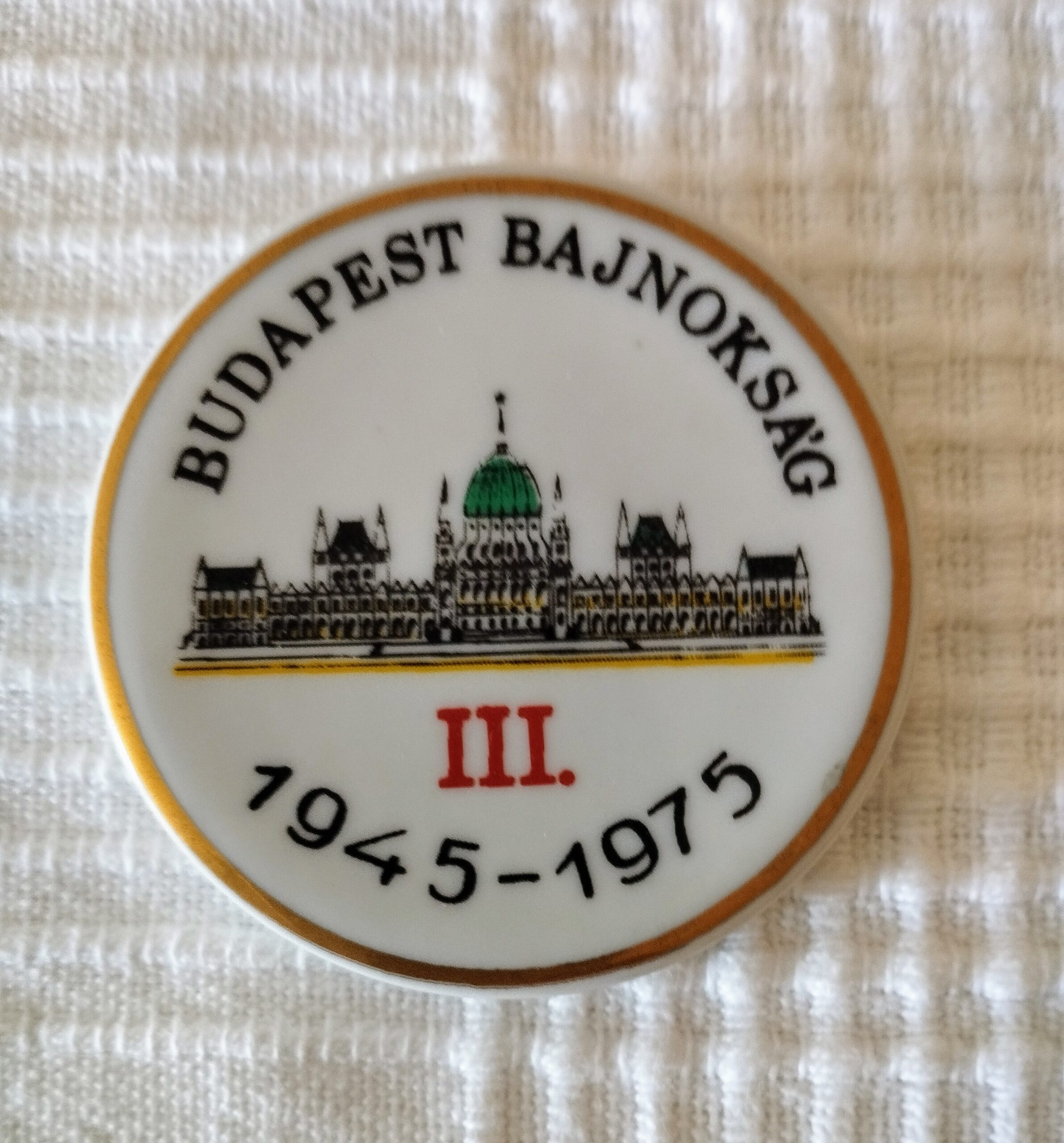 (HU) A hetvenes évek magyar sportéletének egy apró, de annál beszédesebb időkapszulája ez a hófehér Hollóházi porcelán plakett. Az 1975-ös Budapest Bajnokság bronzérmesének – a megőrzött emlékek szerint egy kiváló sportlövőnek – átadott díj központjában a magyar Országház aprólékos grafikája áll, zöld kupolájával és a korszakra jellemző klasszikus tipográfiával. Az „1945-1975” felirat a felszabadulás harmincadik évfordulójának ünnepi emlékversenyére utal. A vékony, nemes arany szegéllyel keretezett korong hátoldalán a zöld fenyőfás Hollóházi pecsét tanúskodik a hazai porcelángyártás minőségéről. Ez a hagyatékból féltve őrzött relikvia makulátlan, vitrin állapotban várja, hogy egy sporttörténeti vagy porcelángyűjtemény megbecsült, mesélő darabja lehessen.