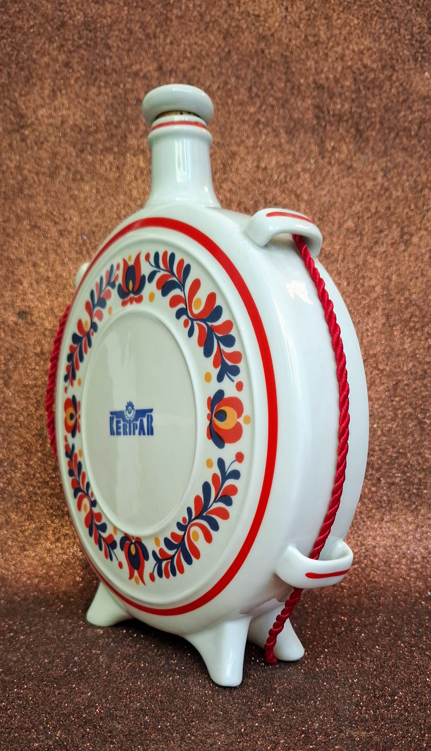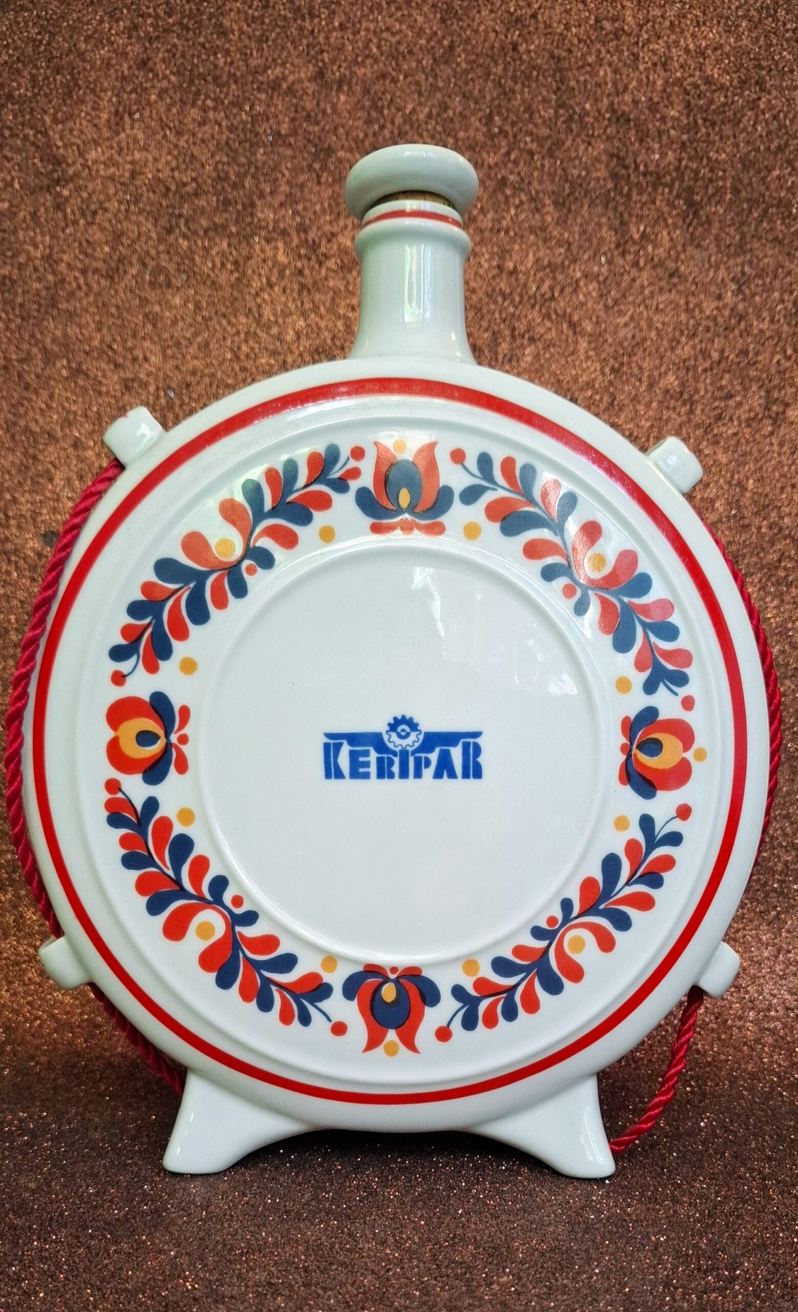 Népies motívumokkal díszített, kézzel festett Hollóházi porcelán kulacs, a legendás magyar porcelángyártás egyik különleges darabja. A fehér alapon élénk piros, kék és sárga virágminták játékosan keretezik a középen található „KERIPAR” logót. A porcelán a KERIPAR megrendelésére készült.