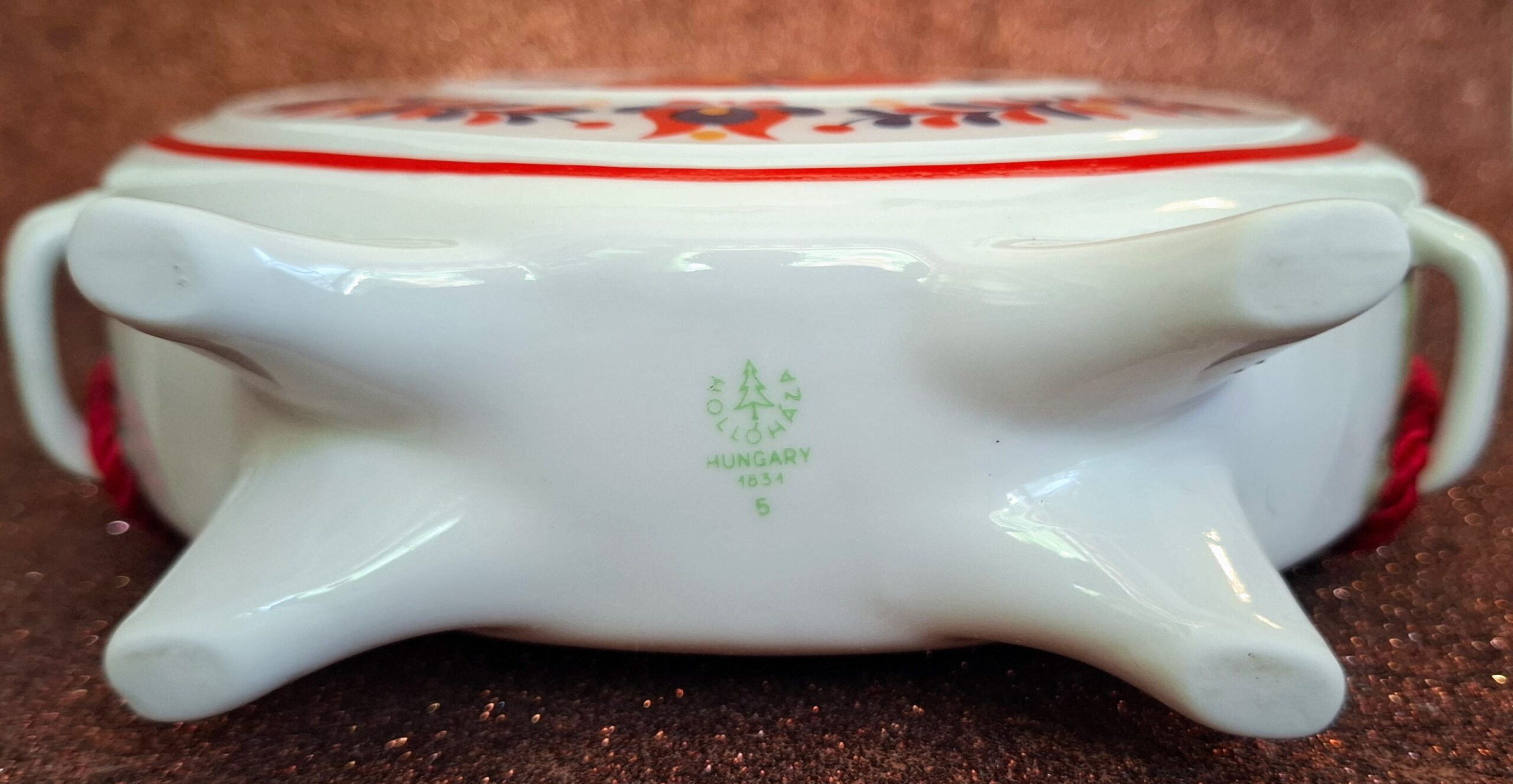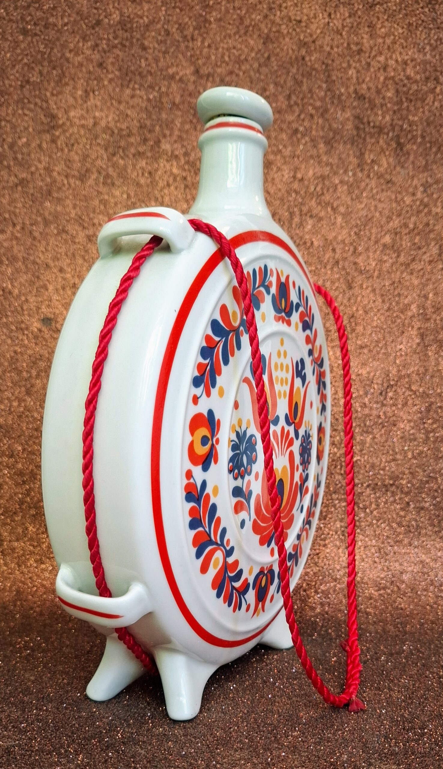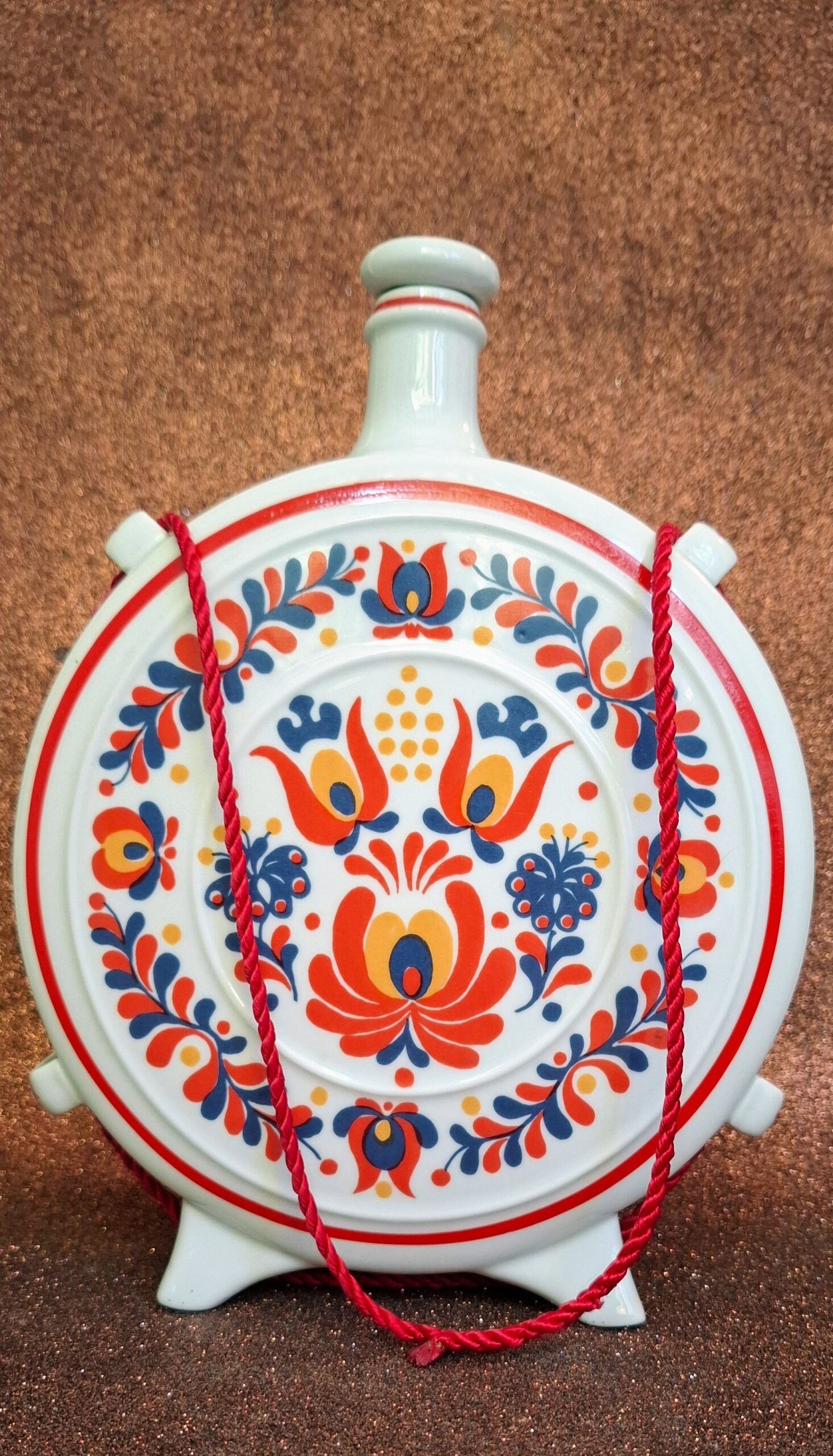 A kulacs négy apró lábon áll, két oldalán fül, rajta piros zsinór, így akár falra akasztva, akár polcra állítva is mutatós. Gyűjteménybe, retro lakásdekorációként vagy ipartörténeti érdekességként egyaránt izgalmas választás.