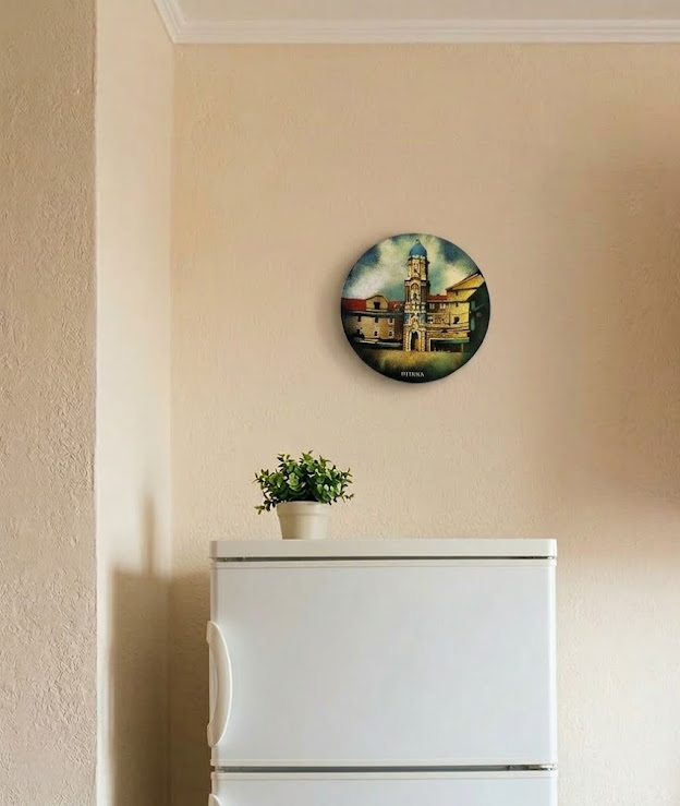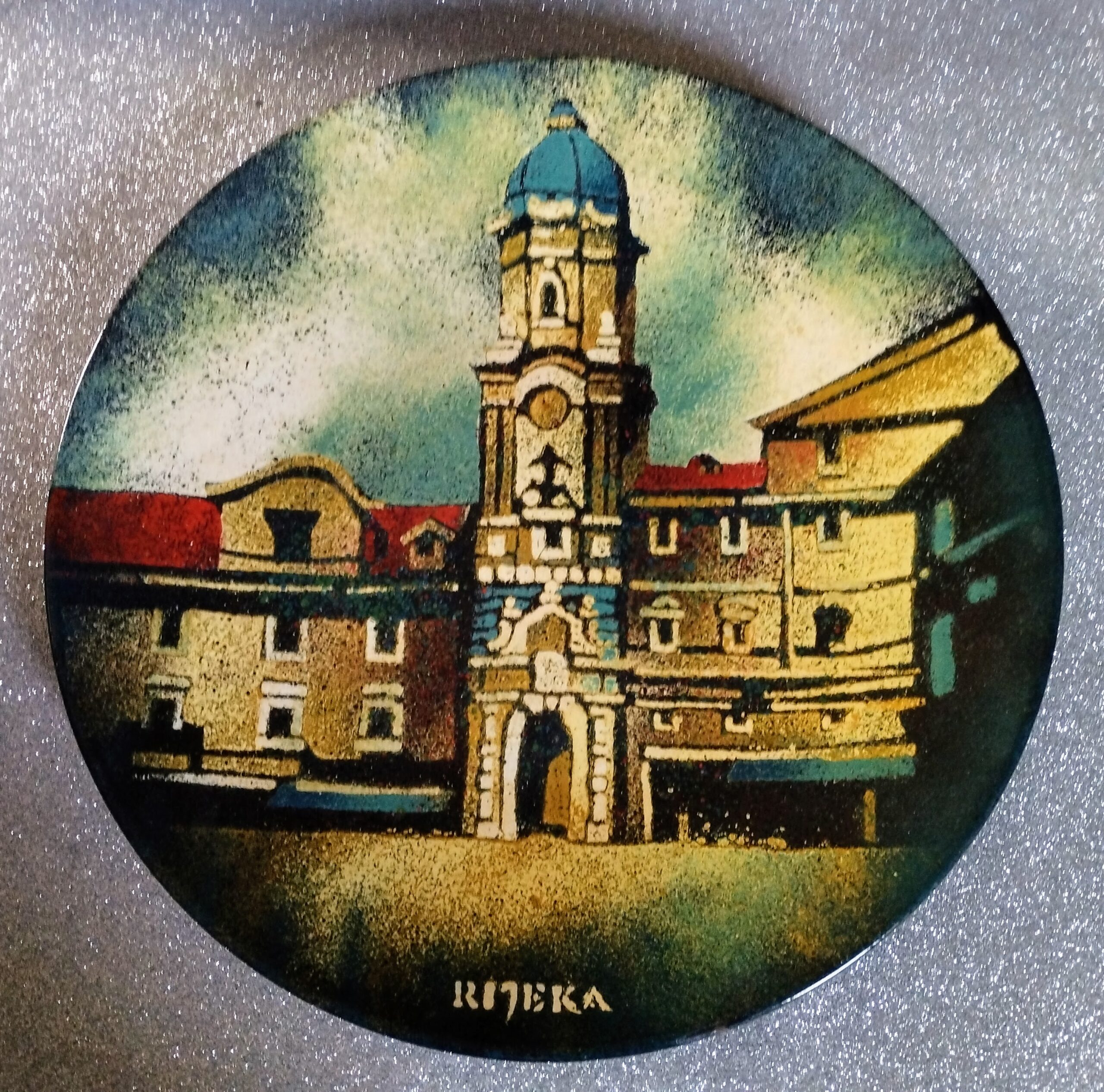 (EN) enamel plate, wall display plate, Rijeka, Fiume, city tower, enamel art, vintage wall decor, retro decoration, collector’s item, estate find, enameled metal