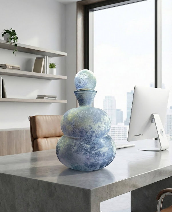 The softly mottled blue, opalescent surface with its cloudy, frosted texture highlights the hand-blown glassmaking technique, where subtle variations make each piece slightly unique. The overall impression is both modern and timeless. It works beautifully as a standalone art object and becomes especially striking when displayed on a console table or in a spacious interior.