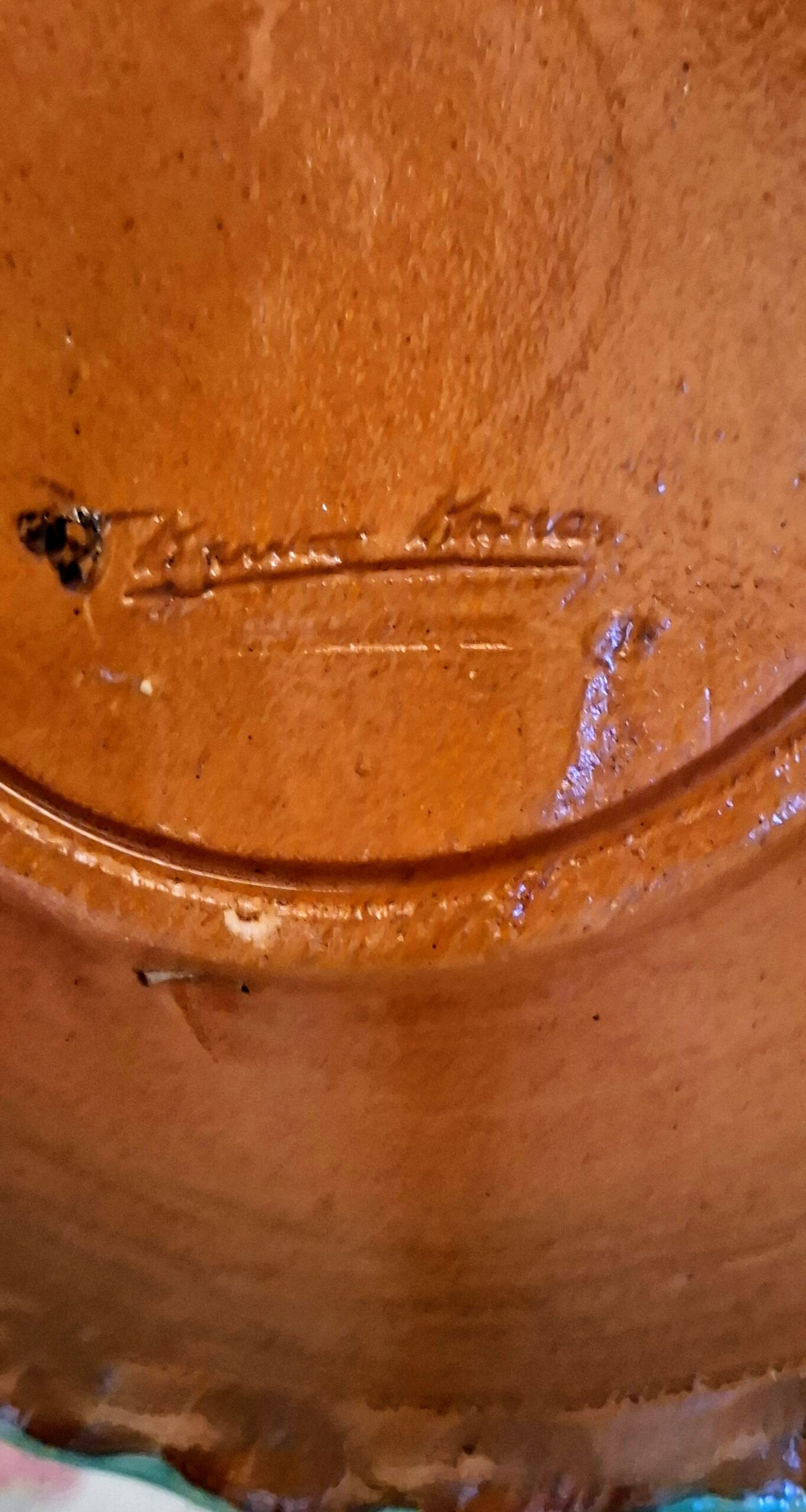Eladó egy gyönyörű, eredeti, kézzel korongolt és festett alföldi népi kerámia dísztányér, mely Kántor Sándor, a híres karcagi fazekas mester munkájaként készült. A hátoldalon jól olvasható, bekarcolt „Kántor Karcag” jelzés található.