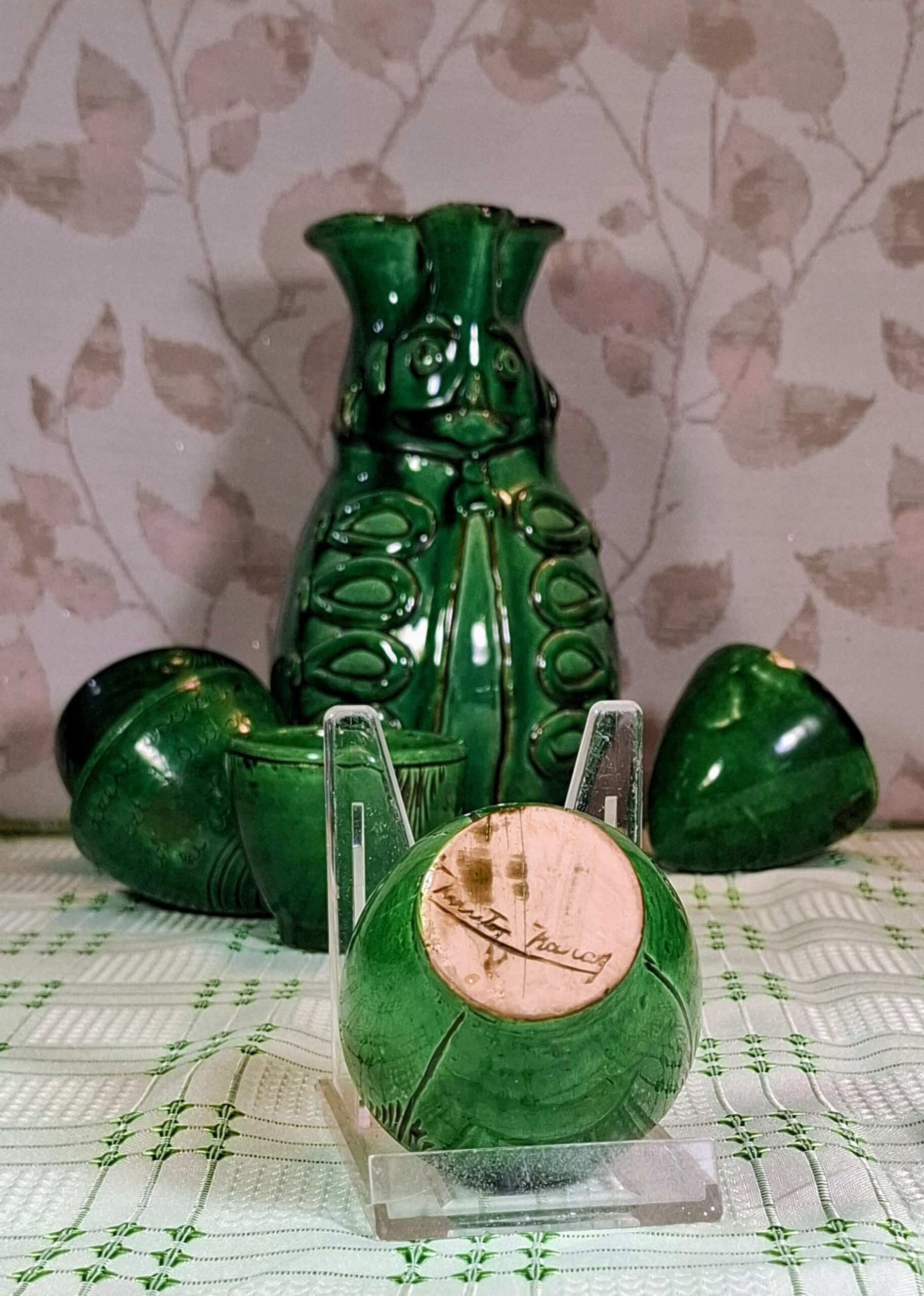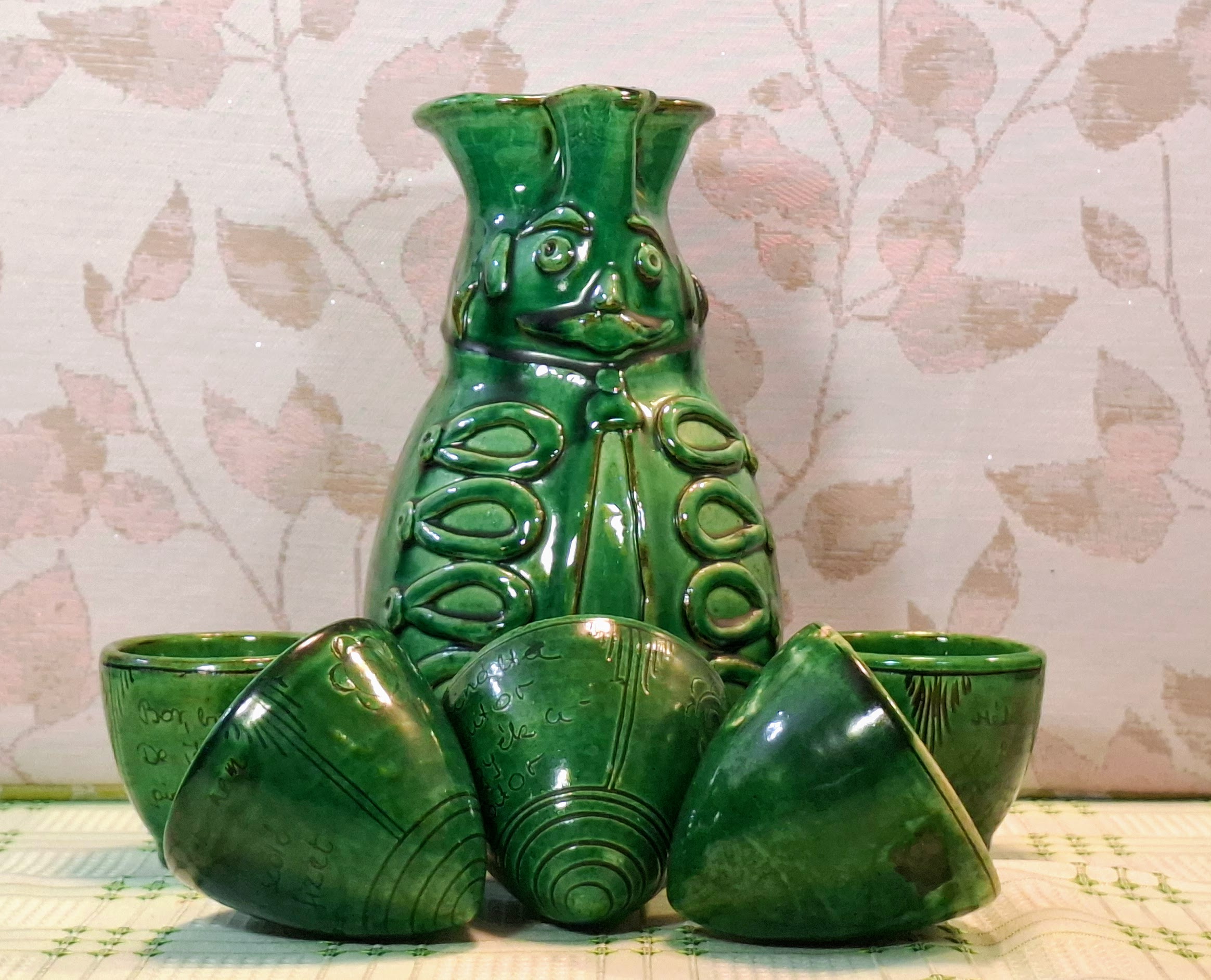 A delightful and very characteristic Hungarian folk pottery set by Sándor Kántor of Karcag, featuring his iconic green-glazed Miska jug accompanied by five matching hand-inscribed shot cups.