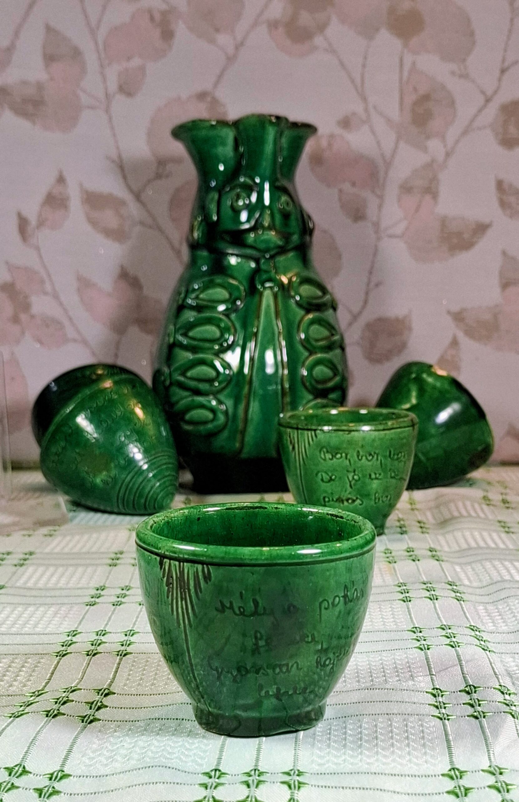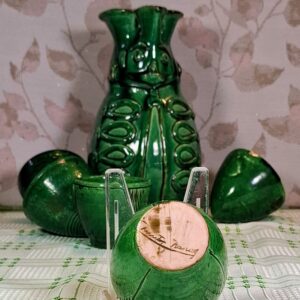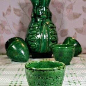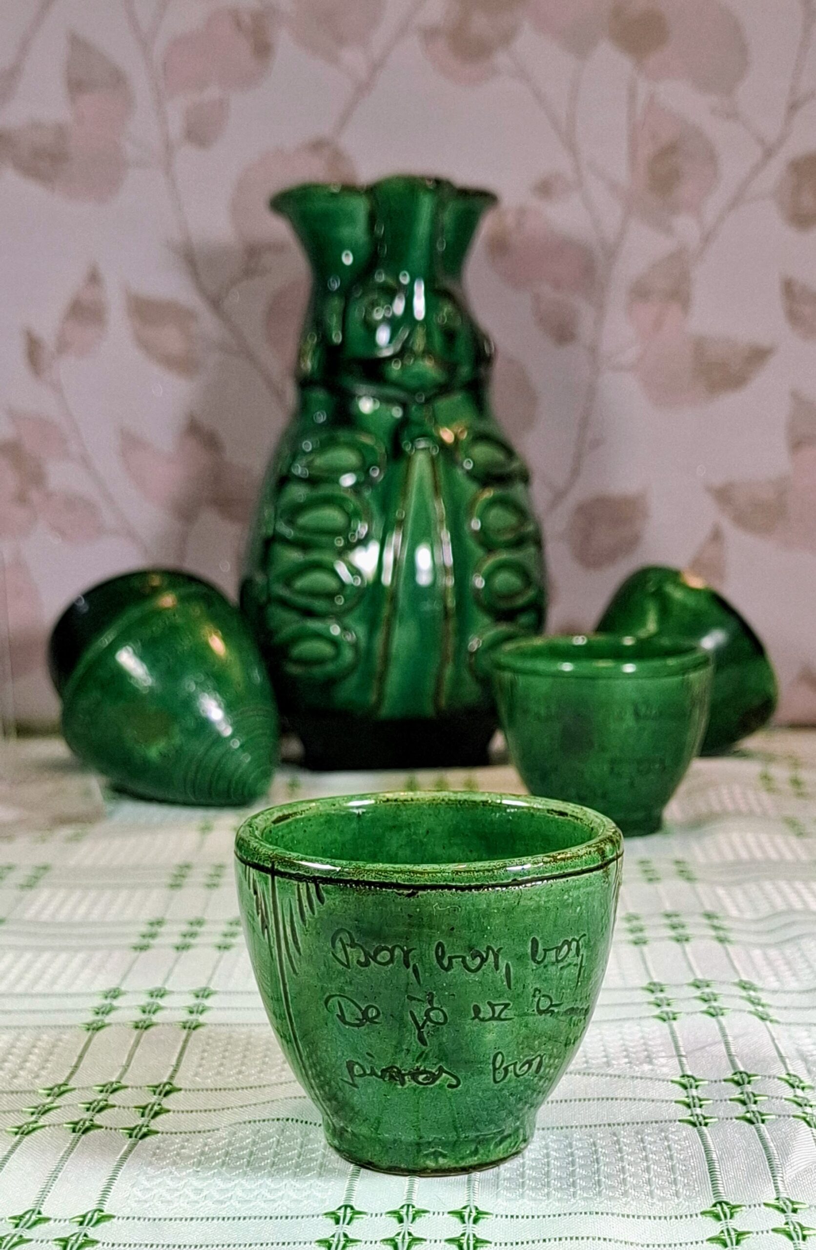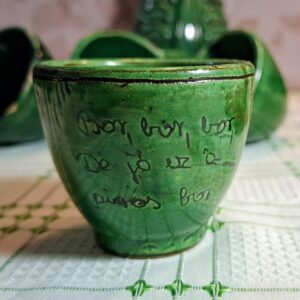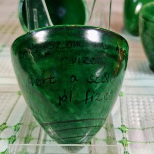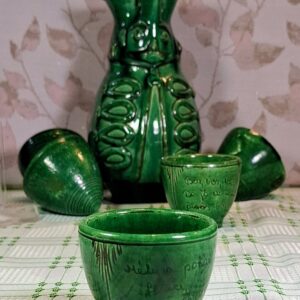 Charming vintage Kántor Sándor – Karcag green-glazed ceramic set: a folk-style Miska jug with five inscribed shot cups. Three are traditional Hungarian “brave man” cups with rounded bases that can’t be set down until emptied. Cups show authentic age and use. A characterful set full of Great Plain spirit.