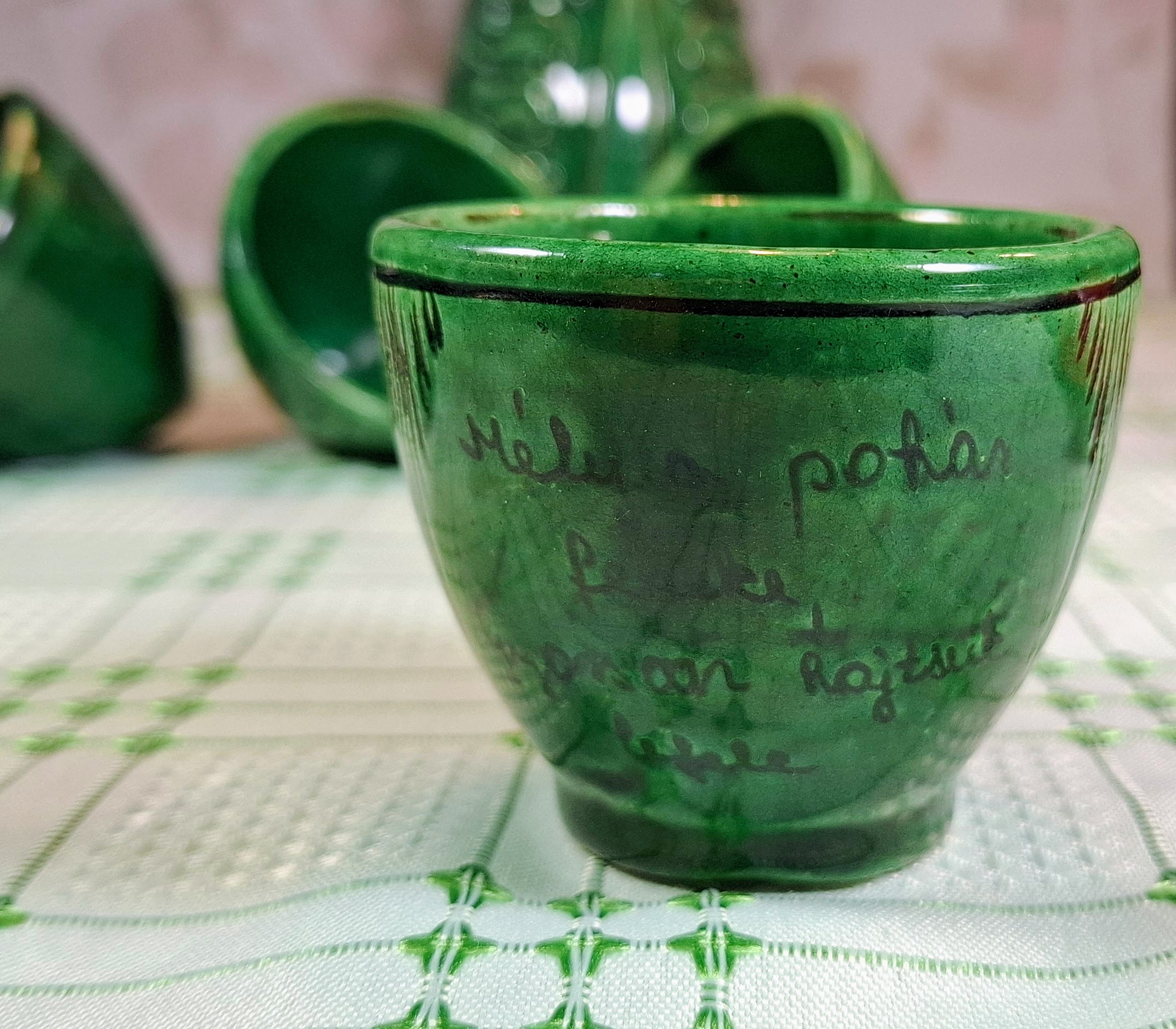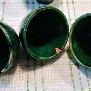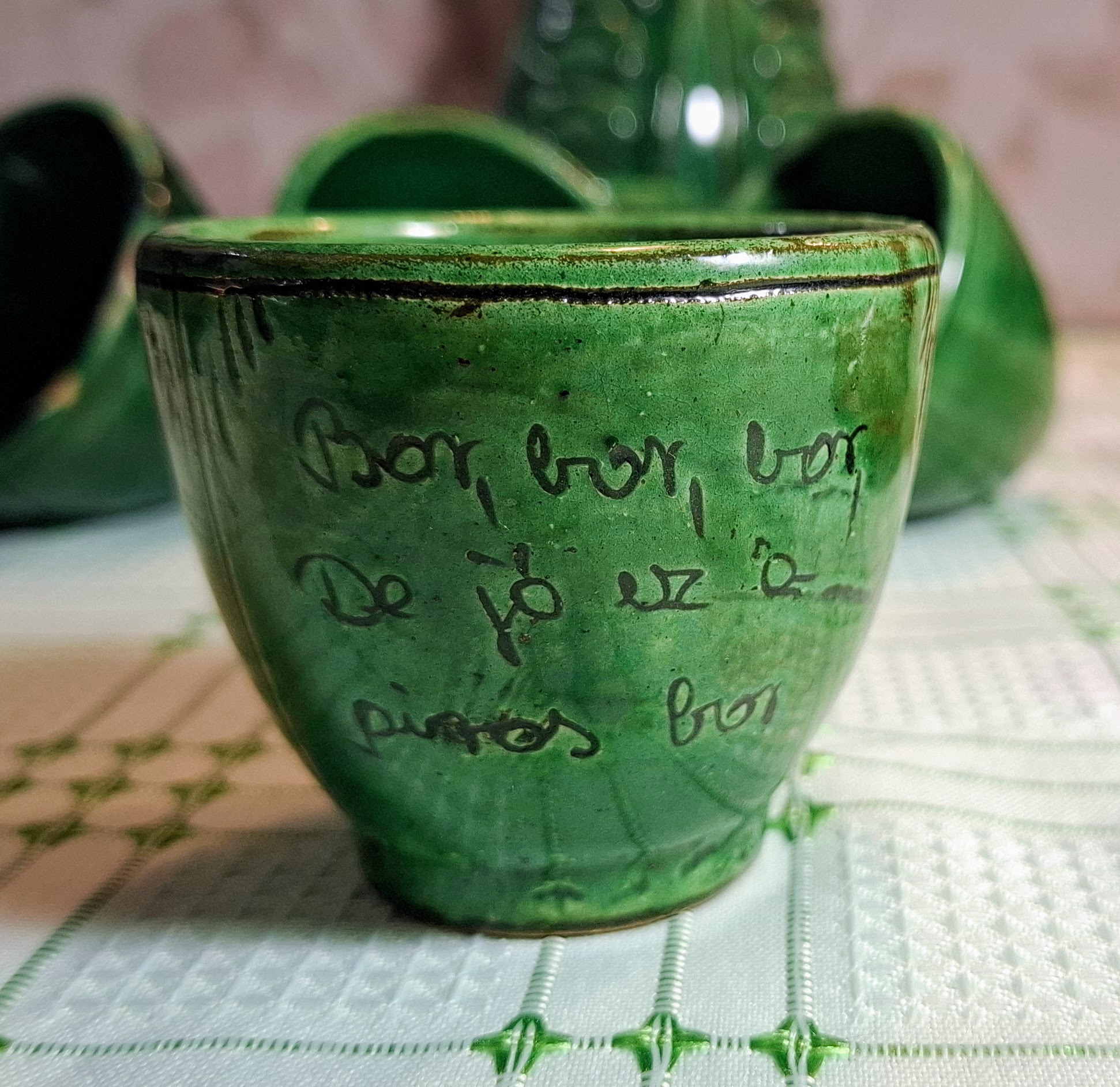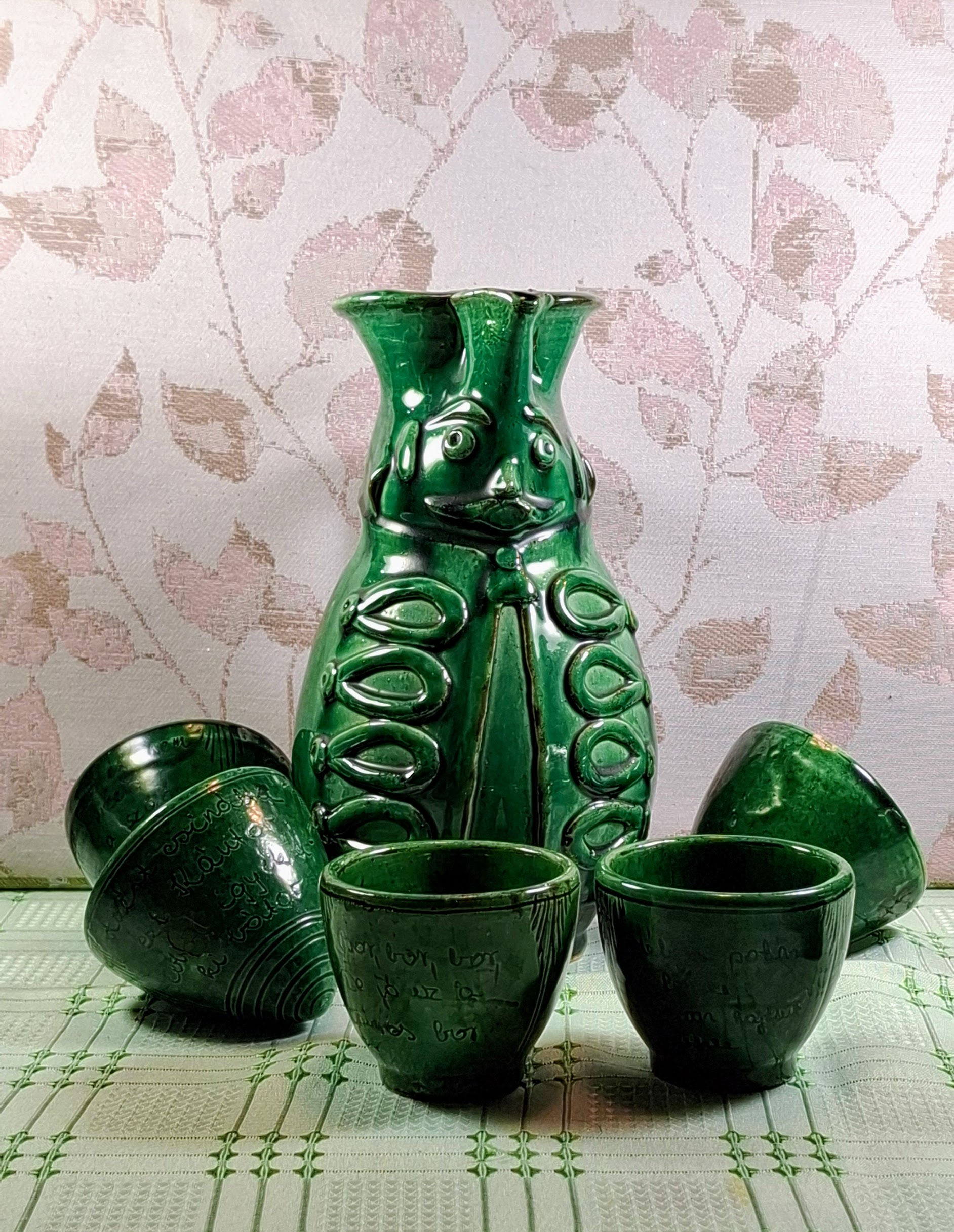Charming vintage Kántor Sándor – Karcag green-glazed ceramic set: a folk-style Miska jug with five inscribed shot cups. Three are traditional Hungarian “brave man” cups with rounded bases that can’t be set down until emptied. Cups show authentic age and use. A characterful set full of Great Plain spirit.
