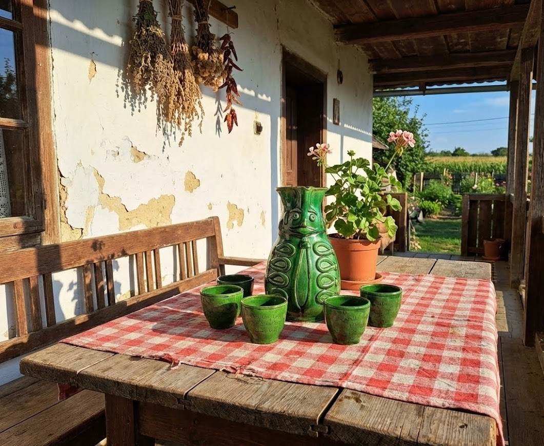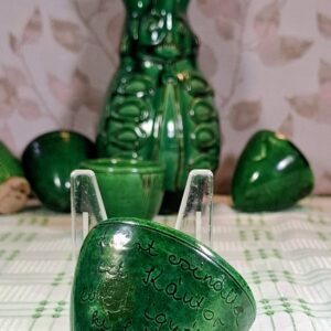 Kántor Sándor (Karcag) jellegzetes, mélyzöld mázas kerámiái mindig különös derűt hoznak az asztalra – ez a teljes, öt poharas Miska-kancsó garnitúra pedig egyenesen a Nagykunság humora és vendégszeretete, kézbe fogható formában.