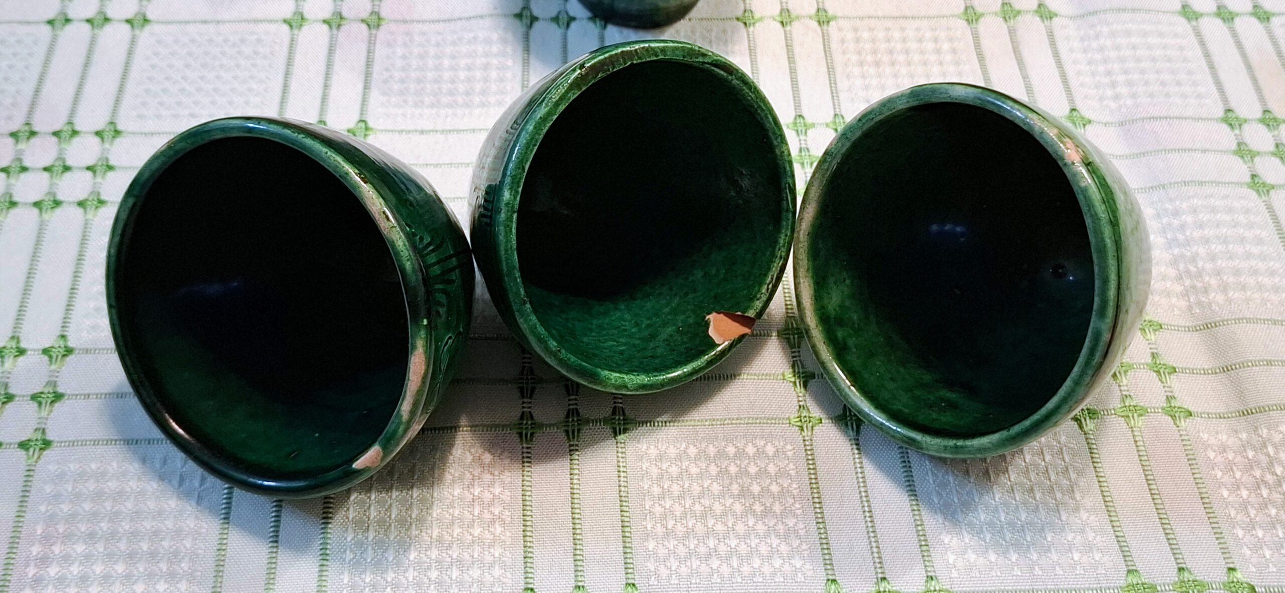 The jug is in excellent vintage condition with beautiful, even glaze. The cups show authentic age, with wear to the rims on all three “brave” cups and one cup having a small glaze chip – entirely typical for pieces that were actually used for their intended purpose.