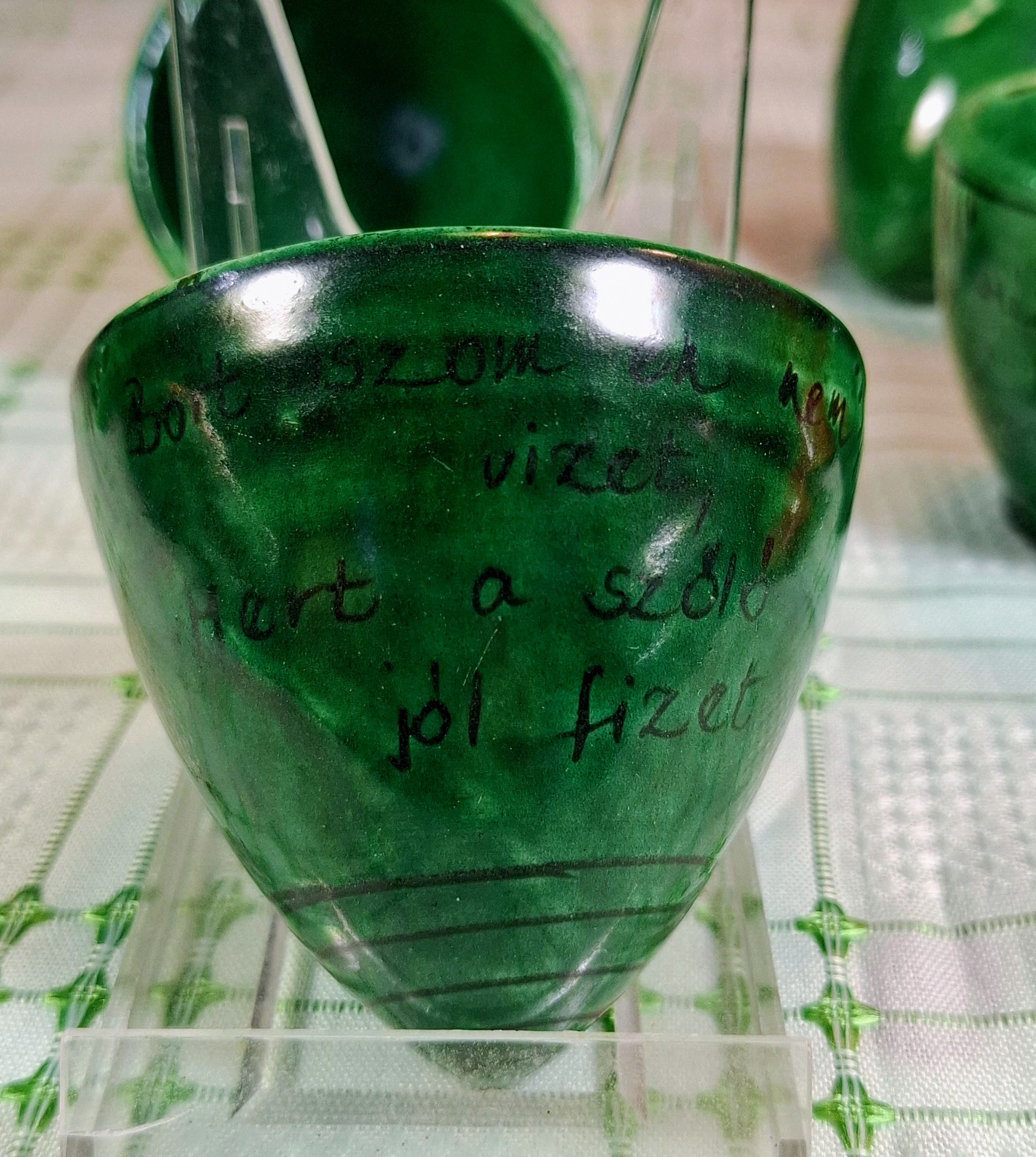 Kántor Sándor (Karcag) zöld mázas Miska-kancsó öt feliratos pohárral. Három „bátor” borulópohár (terminátoros egyhúzásos kivitel), két normál pohár. A bátor darabokon korból eredő kopások és egy kisebb mázleütés található. Hangulatos, humoros, igazi kunsági kerámia.