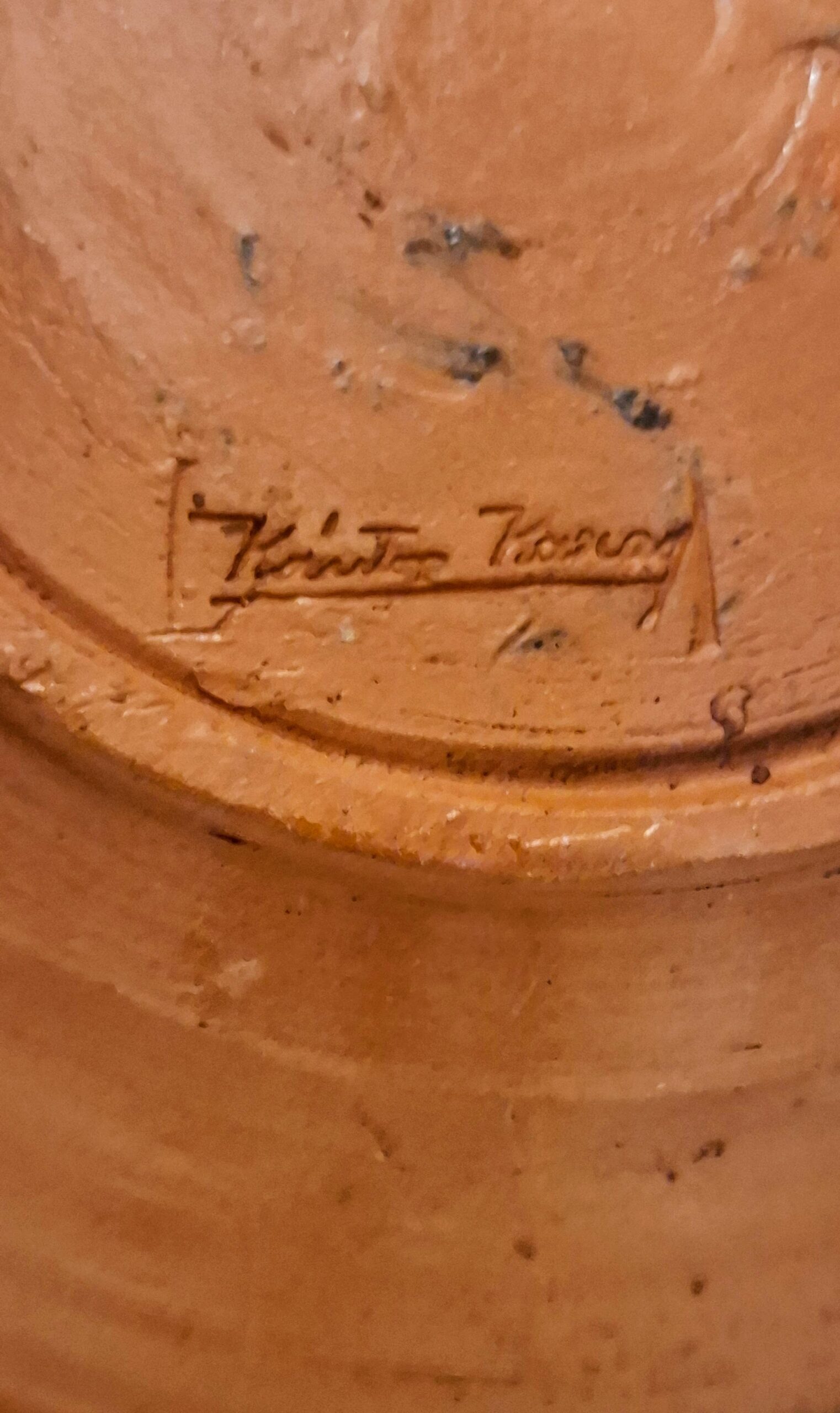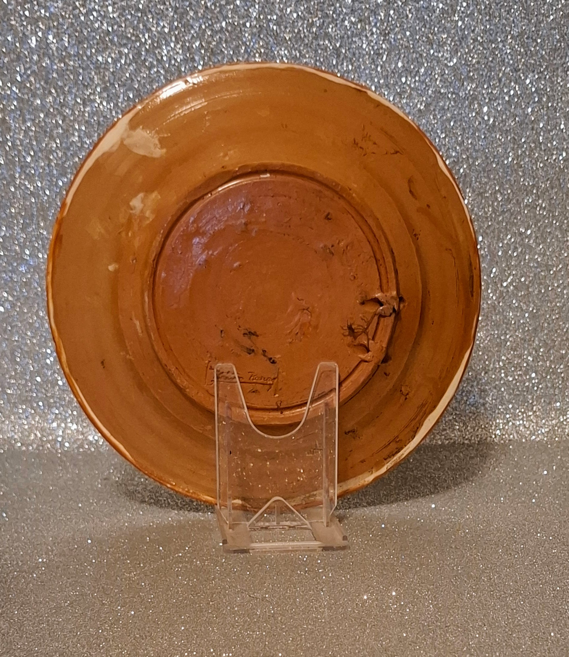 Ez a 22 cm átmérőjű, kézzel korongozott és gazdagon díszített falitányér Kántor Sándor (1928–2009) karcagi fazekasmester hagyatékosan jellegzetes munkái közé tartozik. A mester kézjegye szépen, tisztán olvasható a hátoldalon.