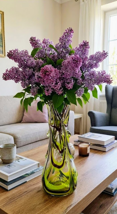 • A massive, thick-walled art glass vase with a hand-pulled crown rim, featuring vibrant yellow-green and deep purple swirling patterns inside the clear glass. Flawless collector condition. Photographed with a bouquet of lilacs in a living room setting, and against a sparkling background
