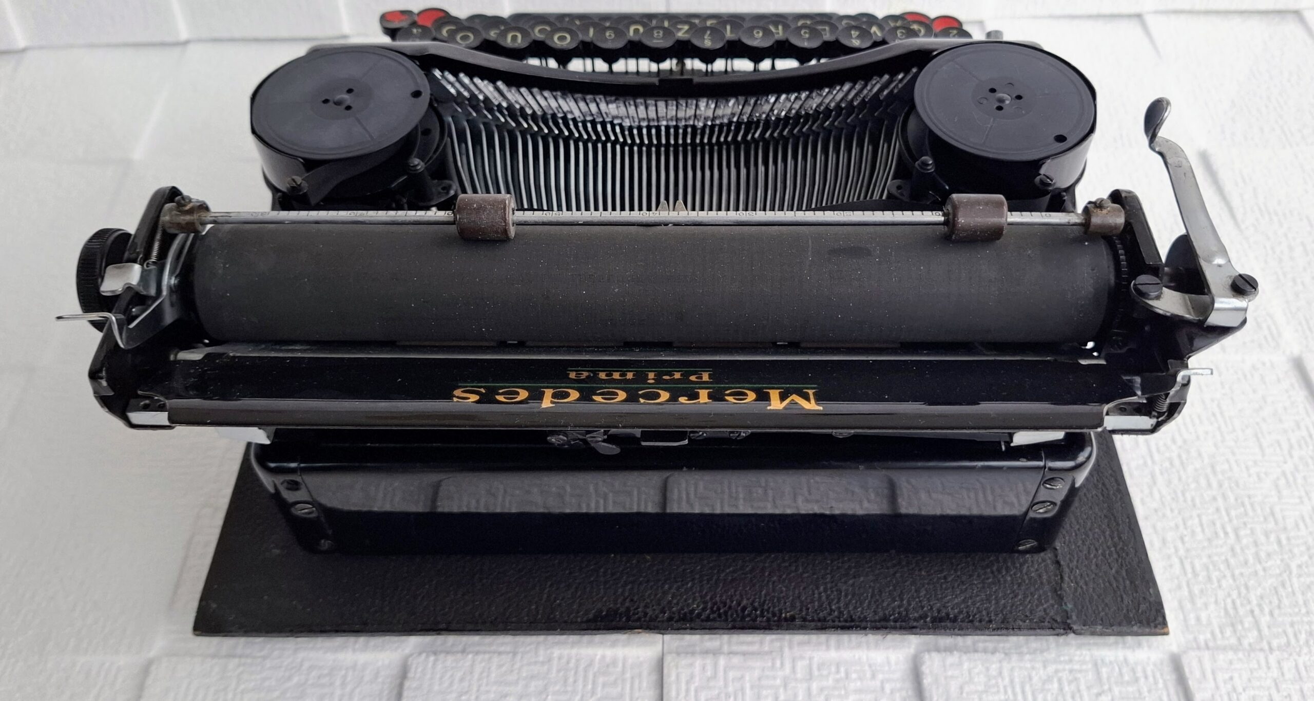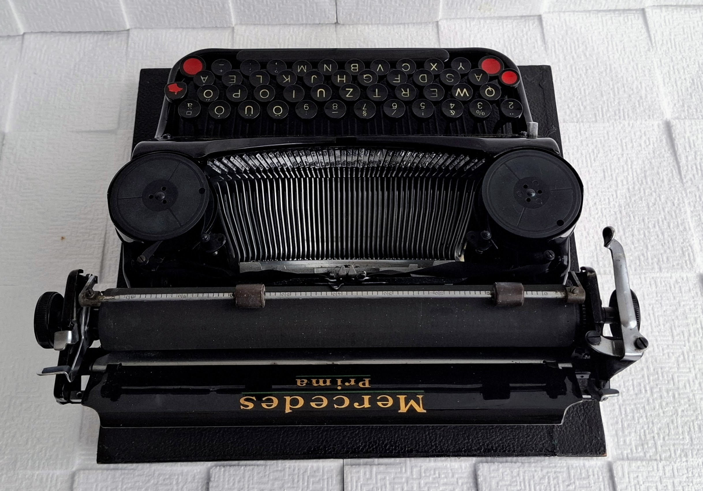 A Mercedes Büromaschinen-Werke A.G. által gyártott Prima modell a korszak mérnöki precizitását és esztétikai igényességét ötvözi. Ez a hordozható, kompakt kialakítású gép az 1930-as években forradalmasította az írást, lehetővé téve a minőségi munkát az irodán kívül is. A gépvázon büszkén díszeleg az eredeti aranyszínű „Mercedes” és „Prima” felirat, valamint a gyártó jellegzetes emblémája.