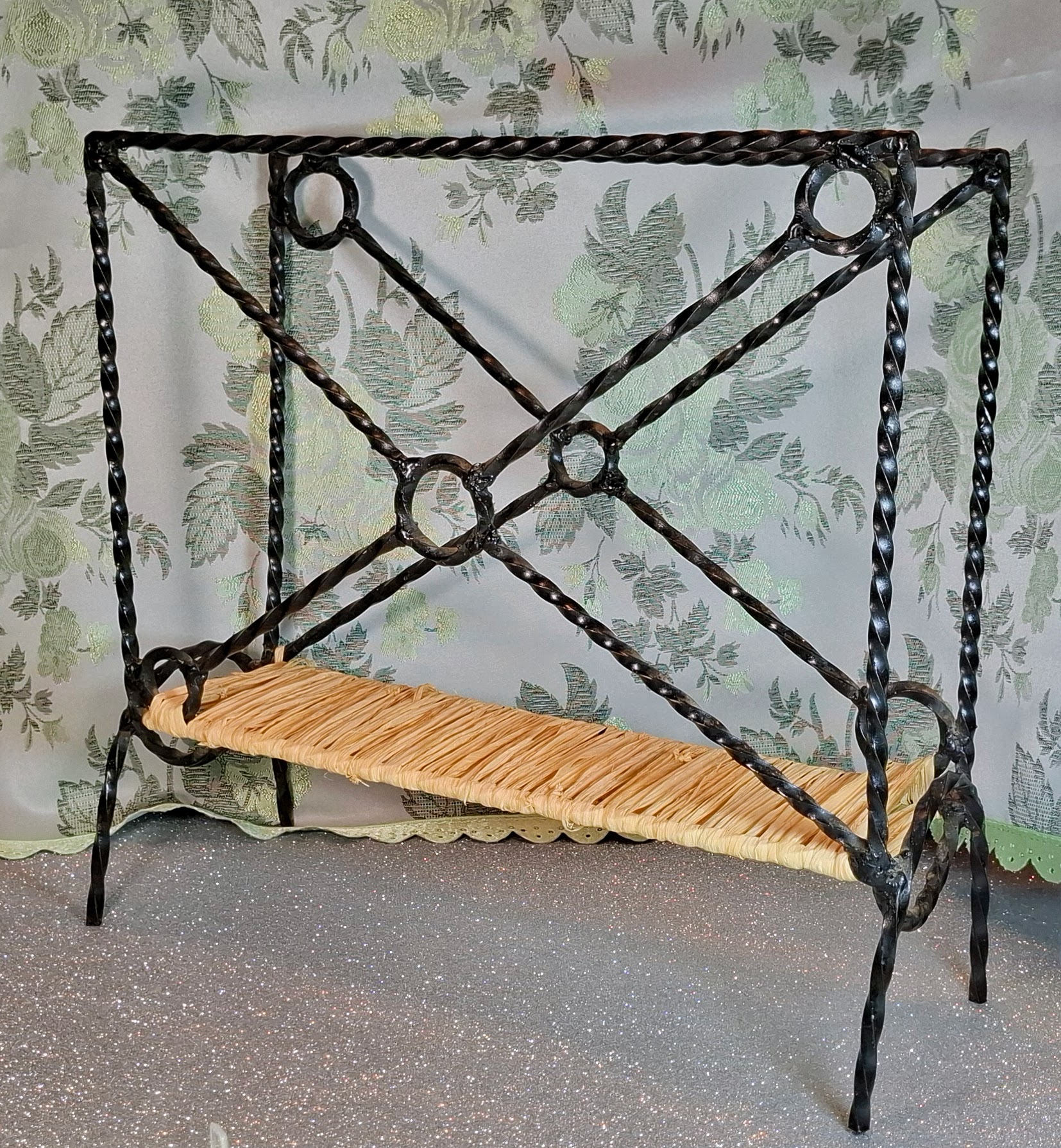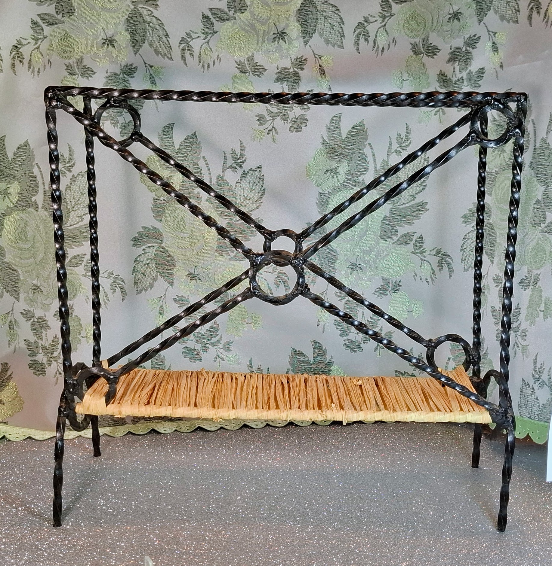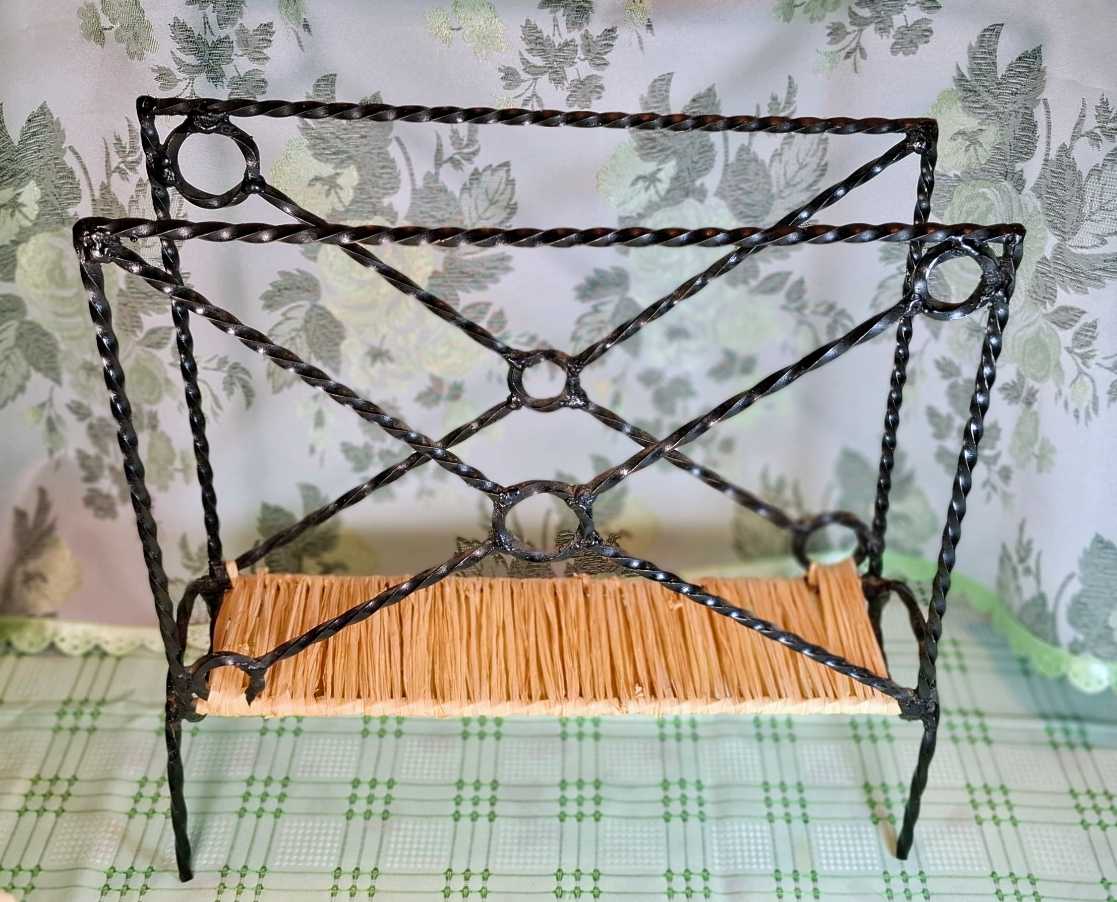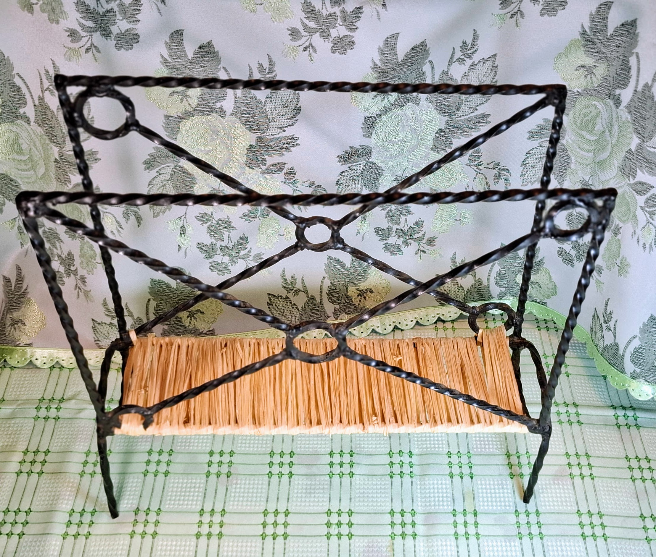 Charming vintage 1960s–70s wrought iron magazine rack, featuring hand-twisted iron bars and decorative circular joints typical of mid-century Central European design. The lower shelf is made of natural raffia, newly replaced (Anita’s meticulous work) and in excellent condition.