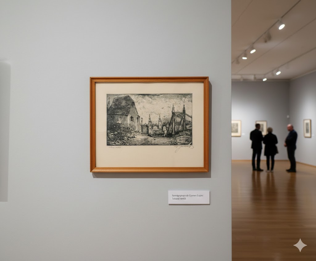 This exquisite copperplate etching (etching) titled Memory from Tabán is by the Hungarian artist Lajos Szentgyörgyvári Gyenes (1890–1971), capturing a nostalgic streetscape of the historic Tabán district in Budapest. Executed in a refined technique, the work balances delicate detail with expressive representation, characteristic of early 20th-century graphic arts.