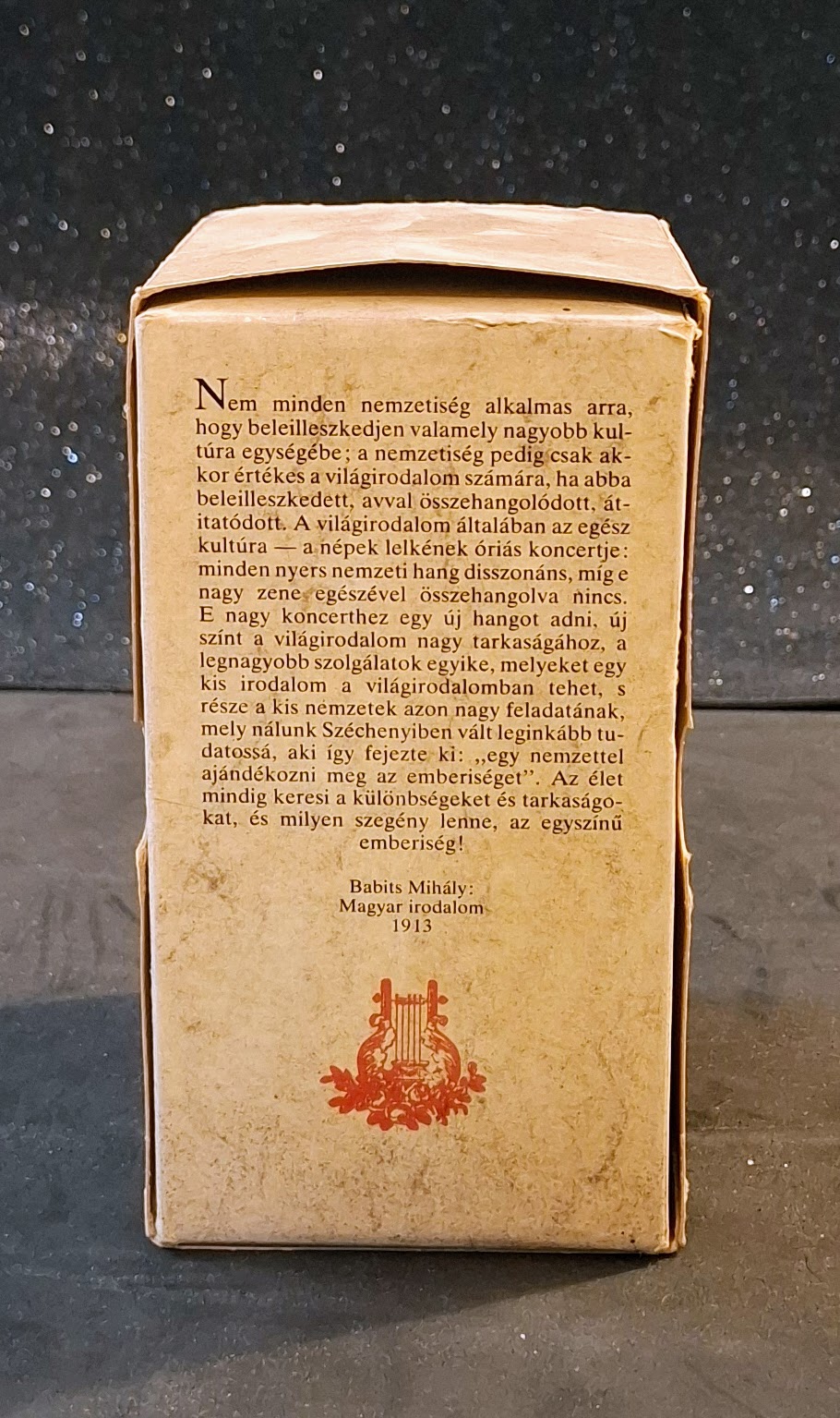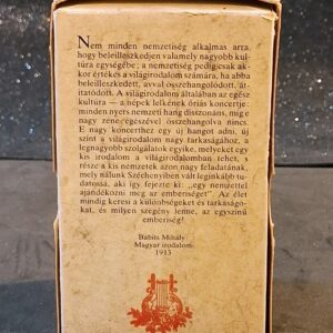 The box is decorated with motifs of medieval Hungarian art and features a quotation from Mihály Babits (1913).