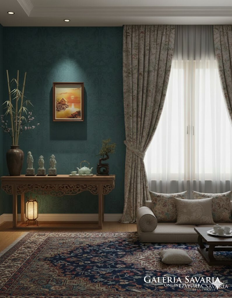 Nagyon jó hangulatú vízpartot ábrázoló selyemkép karton paszpartus keretben.  Hagyatékból származó jó állapotú kép, szerzője ismeretlen, nem szignózott.