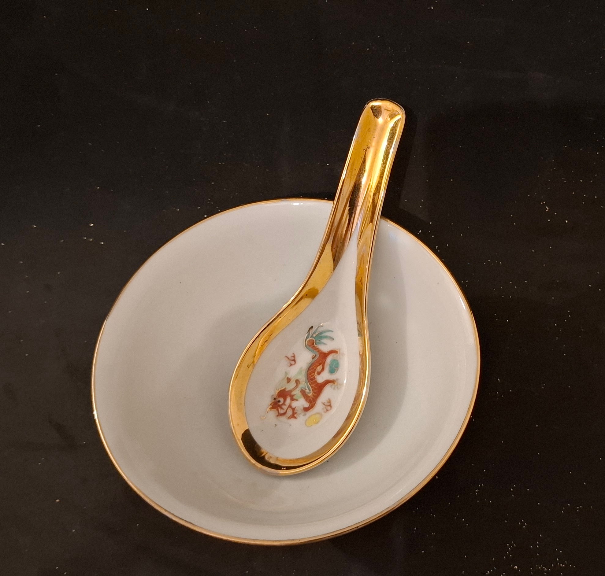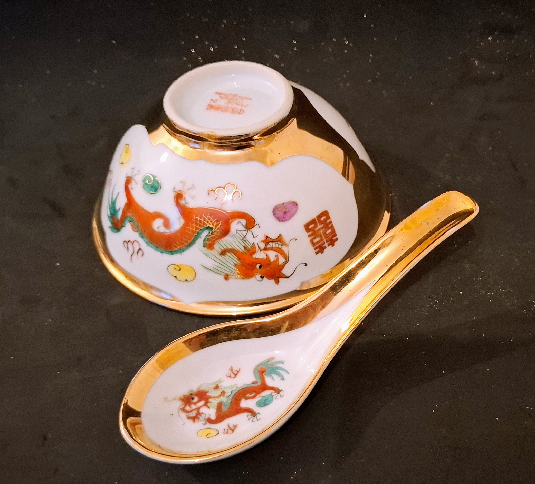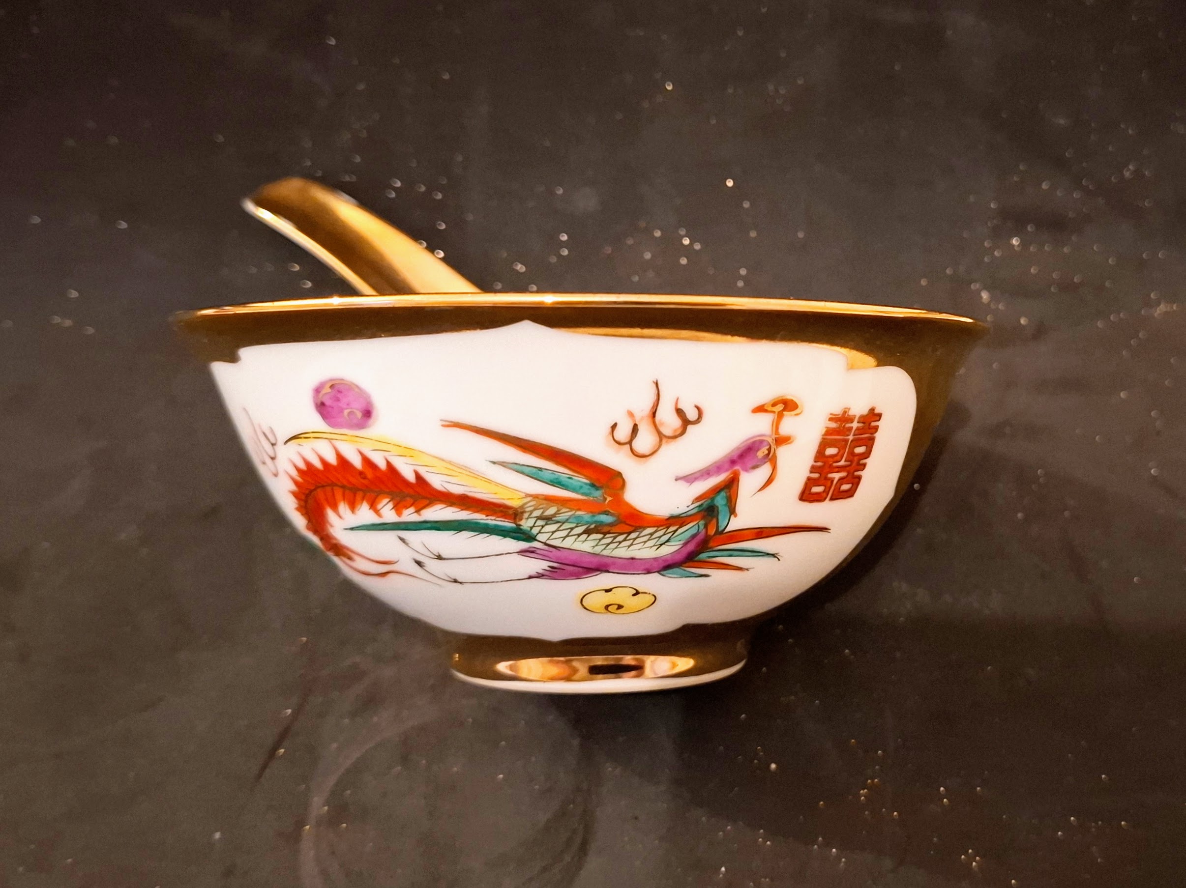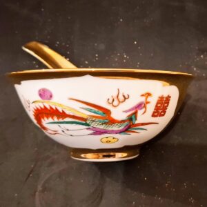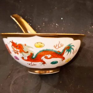 Gazdagon aranyozott, kézzel festett tradicionális kínai porcelán tálka a hozzá illő kanállal. A klasszikus vörös sárkány és színes főnix motívummal díszített szett a harmónia és a szerencse szimbóluma, kiváló állapotú gyűjtői darab vagy dekoráció.