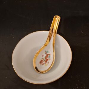 A tárgy különlegessége a bőséges, magas fényű aranyozás, amely a tálka peremét és a kanál nyelét borítja, elegáns és luxus megjelenést kölcsönözve a szettnek. A tálka alján látható vörös pecsétnyomat igazolja a tradicionális készítési módot. Hibátlan állapota miatt nemcsak használati tárgyként (például rizses tálkaként vagy teaszertartáshoz), hanem vitrinben elhelyezett dísztárgyként is megállja a helyét.