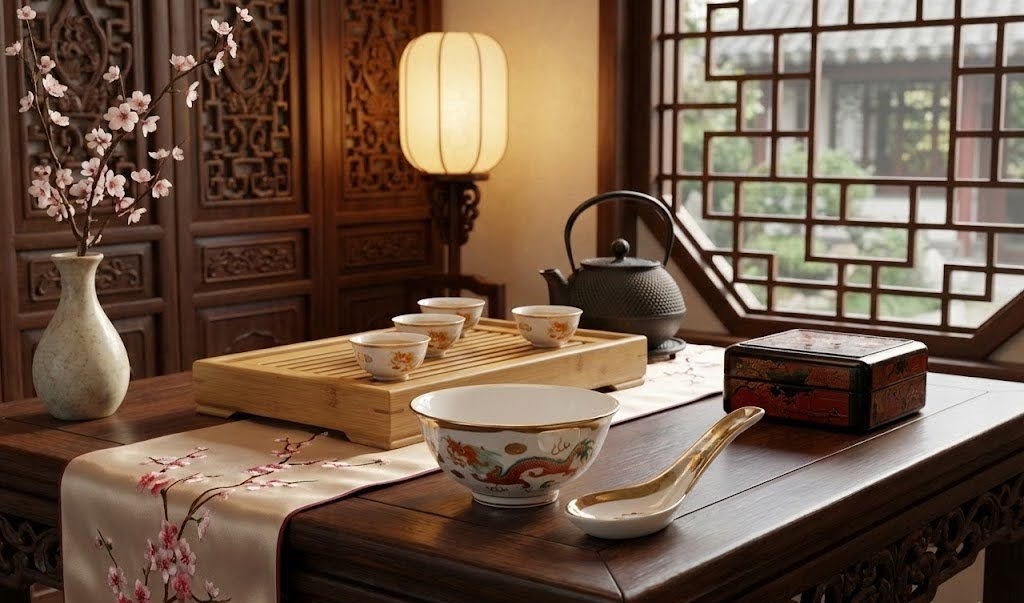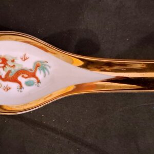 Ez a finom porcelánból készült készlet a kínai iparművészet legkedveltebb szimbólumait vonultatja fel. A tálka külső oldalán és a kanál belsejében a mitikus Sárkány (Long) és a Főnix (Fenghuang) jelenik meg, melyek az ősi kultúrában a férfi és női energiák tökéletes egyensúlyát, valamint a boldogságot és jólétet jelképezik. A figurákat élénk vörös, zöld és lila színekkel, kézzel festett részletekkel dolgozták ki.