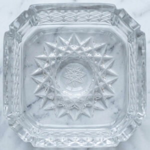 Retro stílusú, négyzetes alapú préselt üveg hamutartó az 1960-as évekből, hagyatékból származó, megkímélt állapotban. A tárgyat elegáns gyémántmintás oldalfalak és az alján található nyolcágú csillagmotívum díszíti, sarkain két cigarettapihenővel. Az alján látható félholdas jelzés teszi különlegessé ezt a masszív, színtelen üvegből készült vintage darabot.
