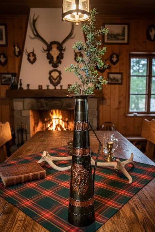 Vadászjelenetes réz szálváza a vadászház asztalán.