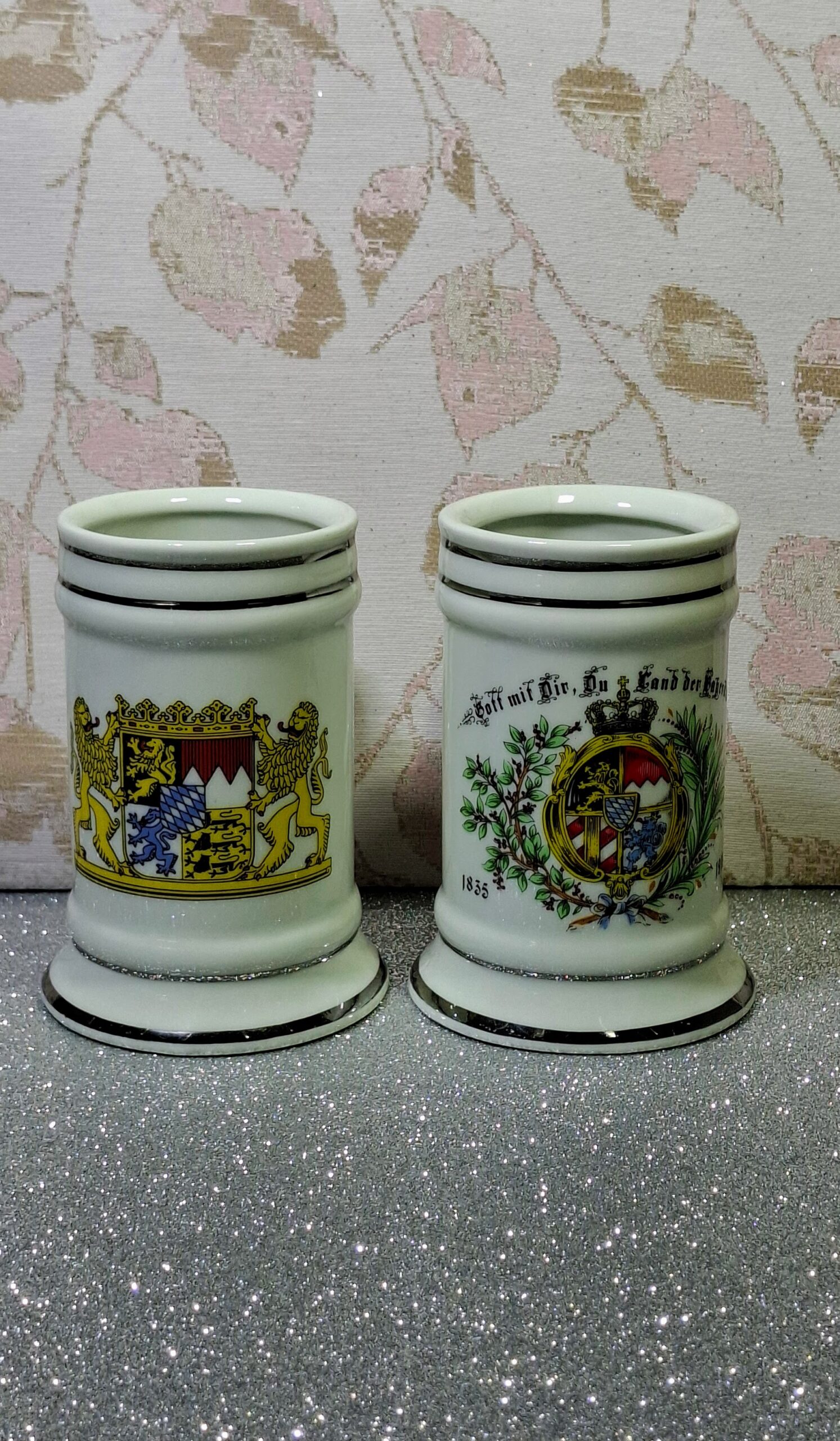 Két darab finom porcelánból készült miniatűr söröskorsó, mindkettő ezüstszínű szegéllyel, a Bajor Királyság címerével díszítve.