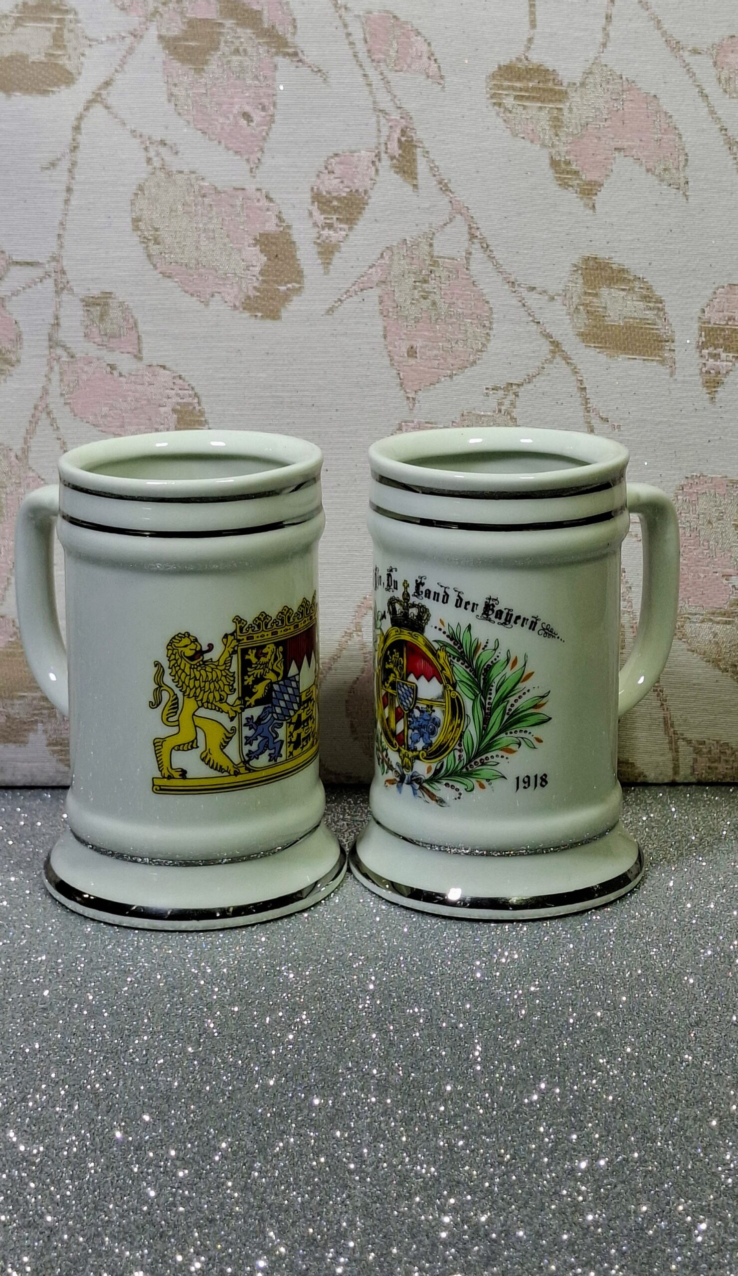 This pair of miniature porcelain beer mugs was produced in Waldsassen, Bavaria, a region well known for its long tradition of fine porcelain manufacturing. Each small tankard is decorated with the Bavarian coat of arms, symbolizing regional identity, heritage, and traditional beer culture.
