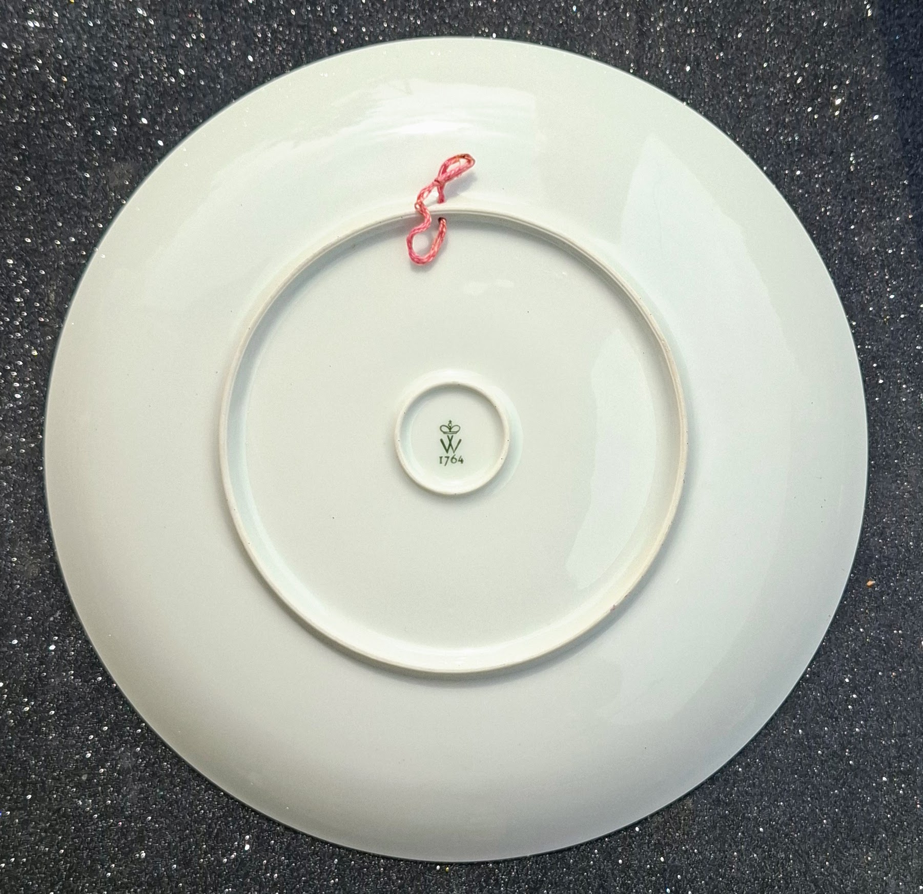 A tányér hátoldalán a gyári jelzés (korona és „W 1764”), valamint akasztózsinór található, így falra is könnyedén elhelyezhető.