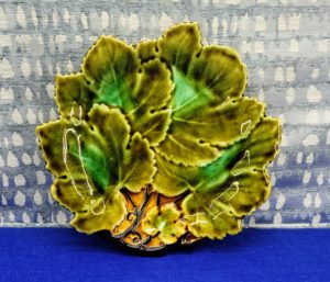 Josef Steidl Znaim majolika levél formájú süteményes kistányér pár – 19. század vége / Pair of Josef Steidl Znaim Majolica Leaf-Shaped Dessert Plates, Late 19th Century