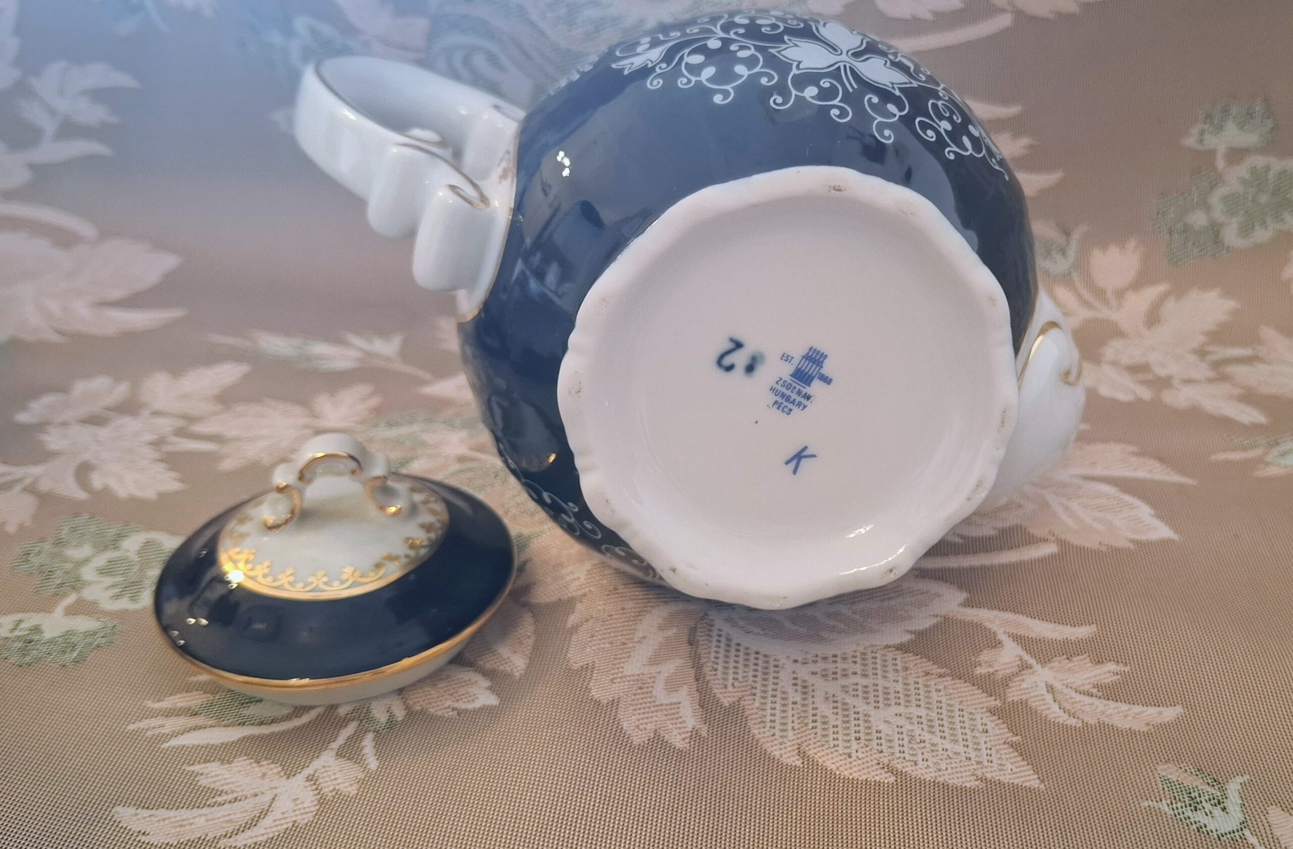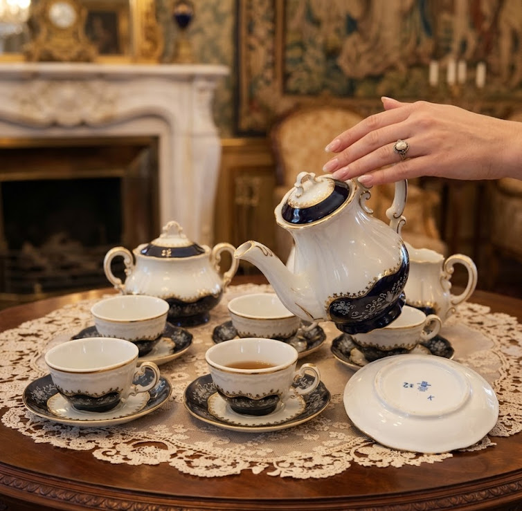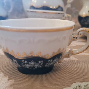 A Zsolnay Pompadour II. kollekció nem csupán egy étkészlet, hanem a magyar porcelánművészet egyik legmeghatározóbb szimbóluma. A 20. század második felének stílusát idéző formavilág a barokk eleganciát ötvözi a modern precizitással. A mélykék kobalt alapra kézzel felvitt ezüstös indamotívumok és a gazdag, 24 karátos arany szegélyek együttesen teremtenek fejedelmi megjelenést. A készlet tartalma: 6 darab csésze a hozzá tartozó aljakkal, egy elegáns kávékiöntő, egy cukortartó és egy tejkiöntő. Minden darab alján megtalálható az autentikus kék, ötpajzsos Zsolnay pecsét, amely a pécsi gyár kiváló minőségét igazolja. Ez a garnitúra kiválóan alkalmas reprezentatív alkalmakra vagy egy nívós antikvitás-gyűjtemény ékkövének, hiszen állapota teljesen kopás- és sérülésmentes.