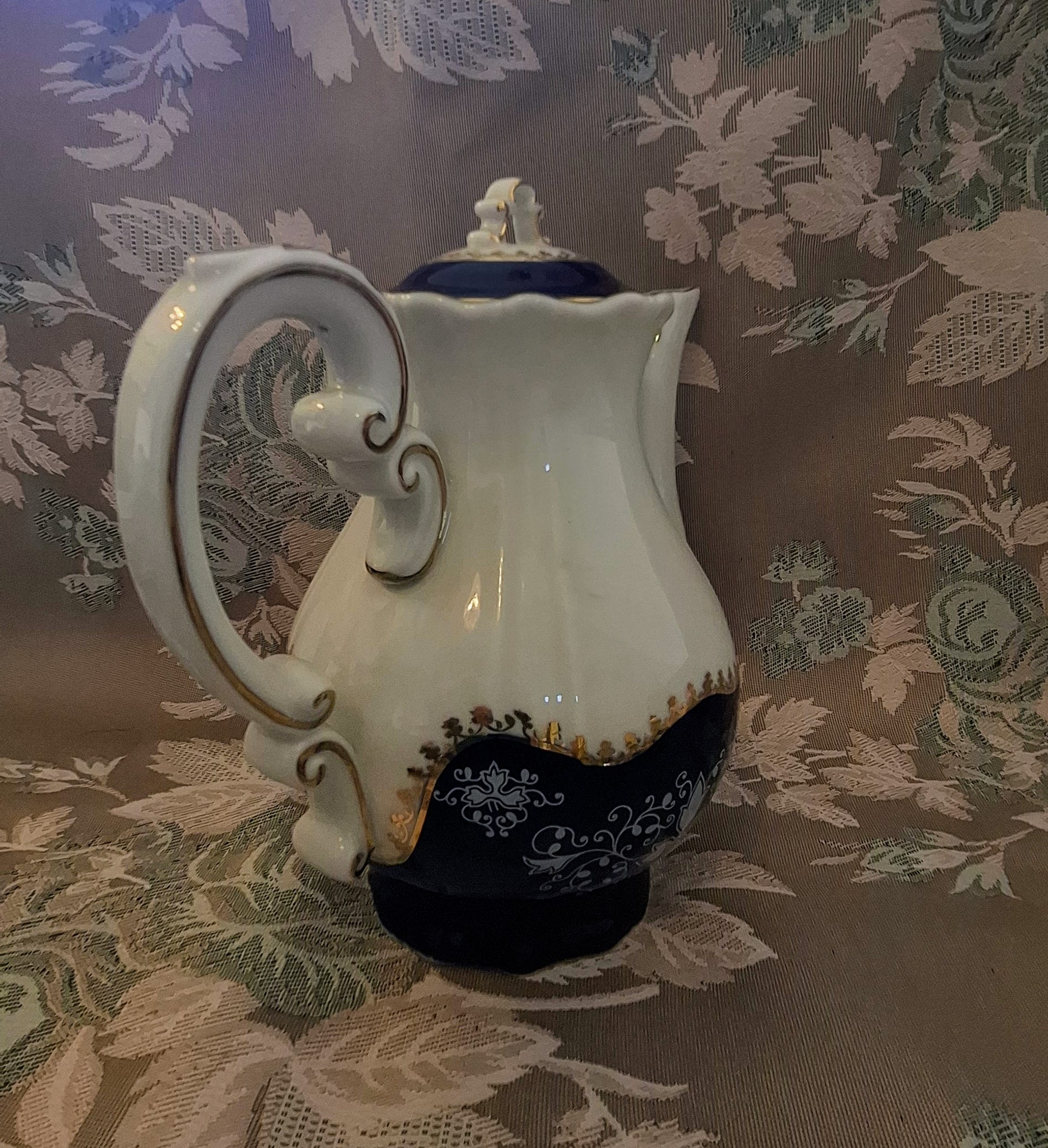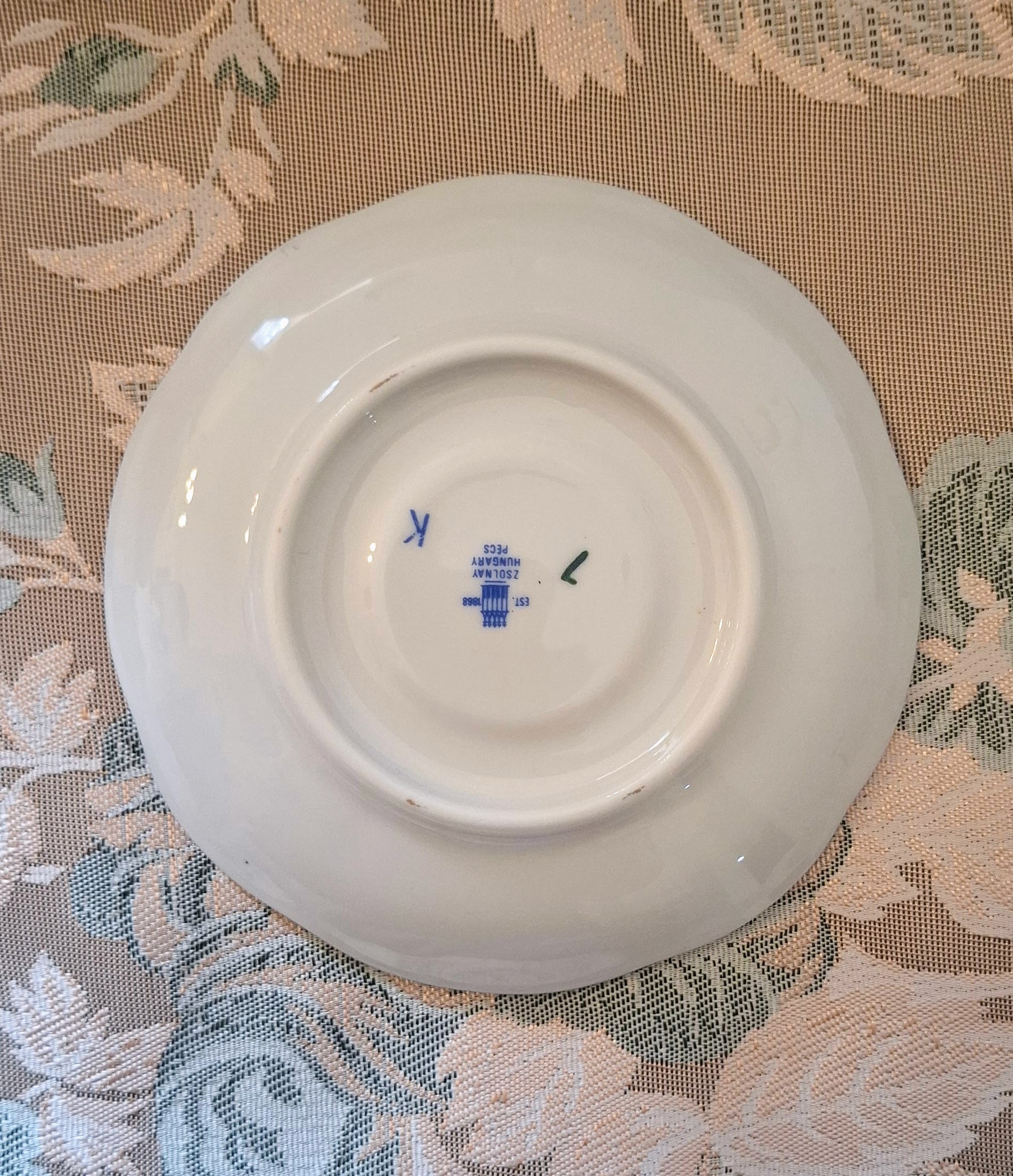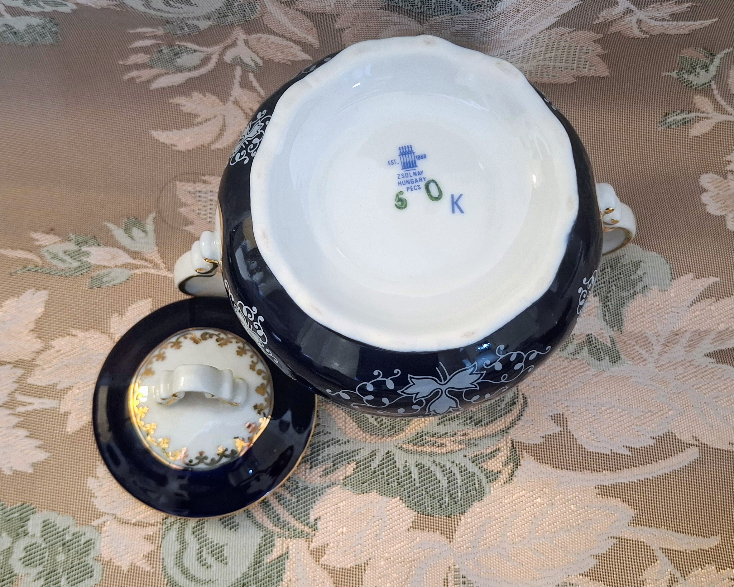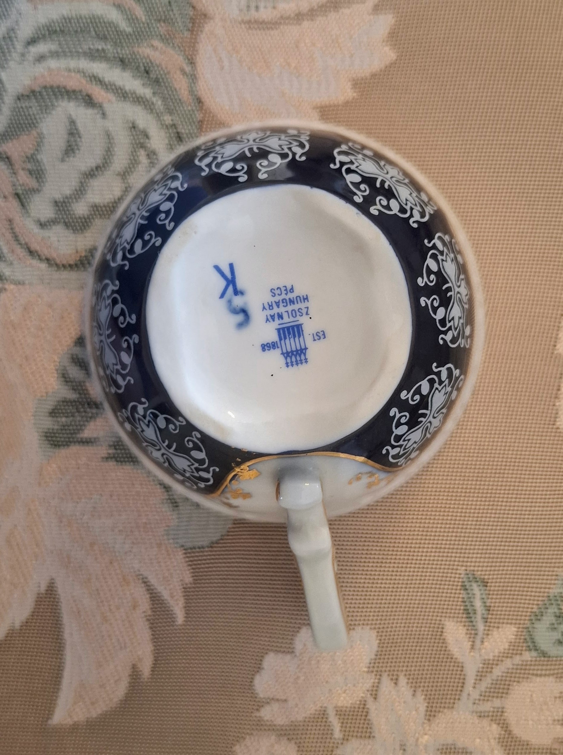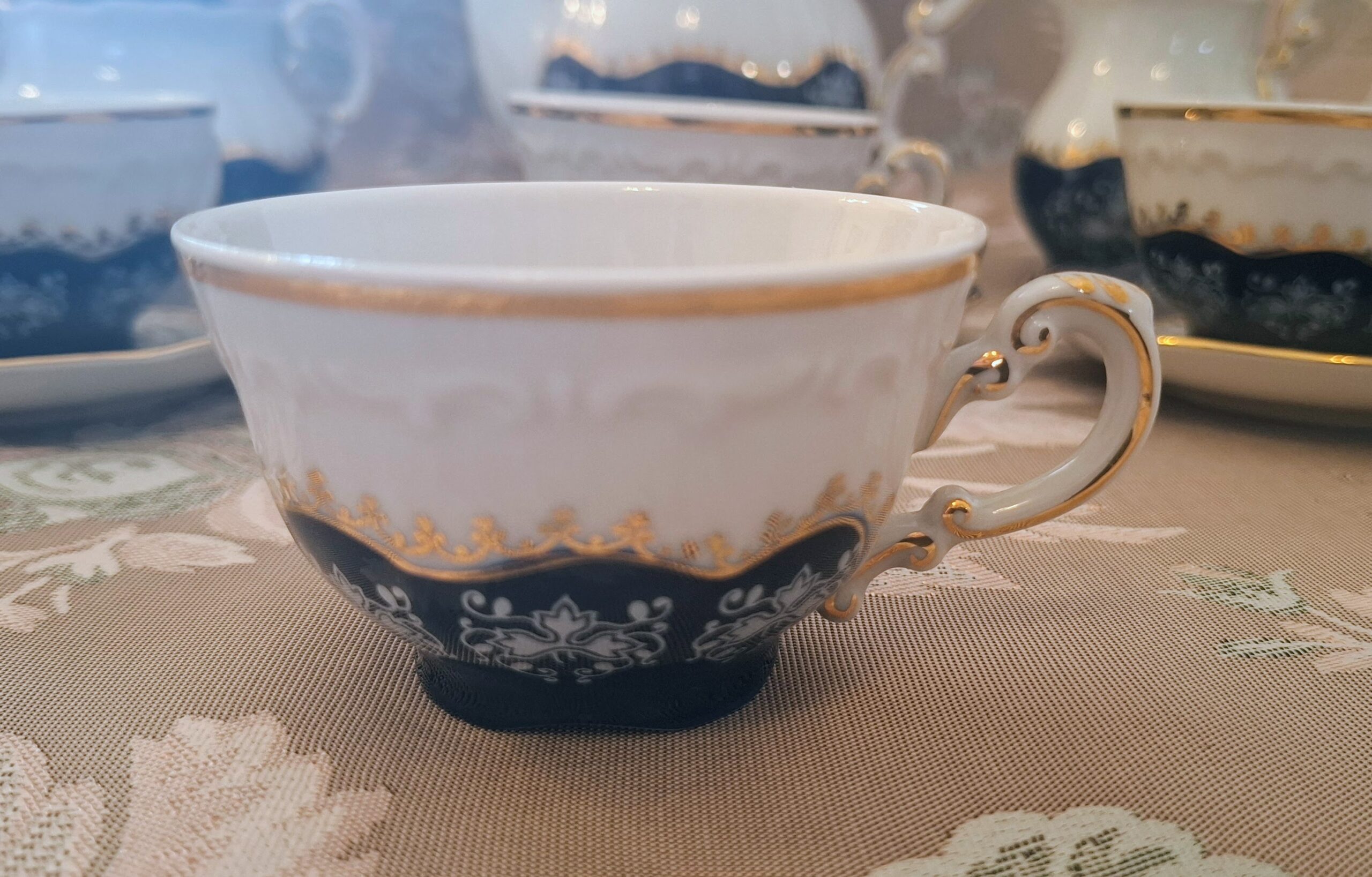 • Complete 15-piece Zsolnay Pompadour II coffee set arranged on a wooden table with a lace tablecloth.